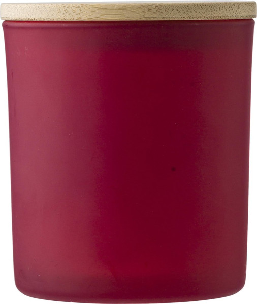 Glazen kaars met plantaardige was en een deksel van bamboe. De kaars bevat voornamelijk...meer