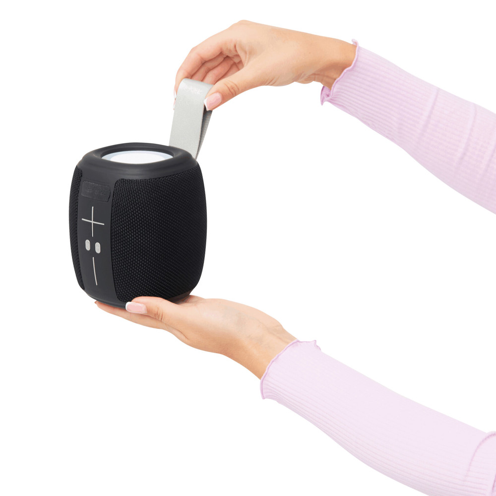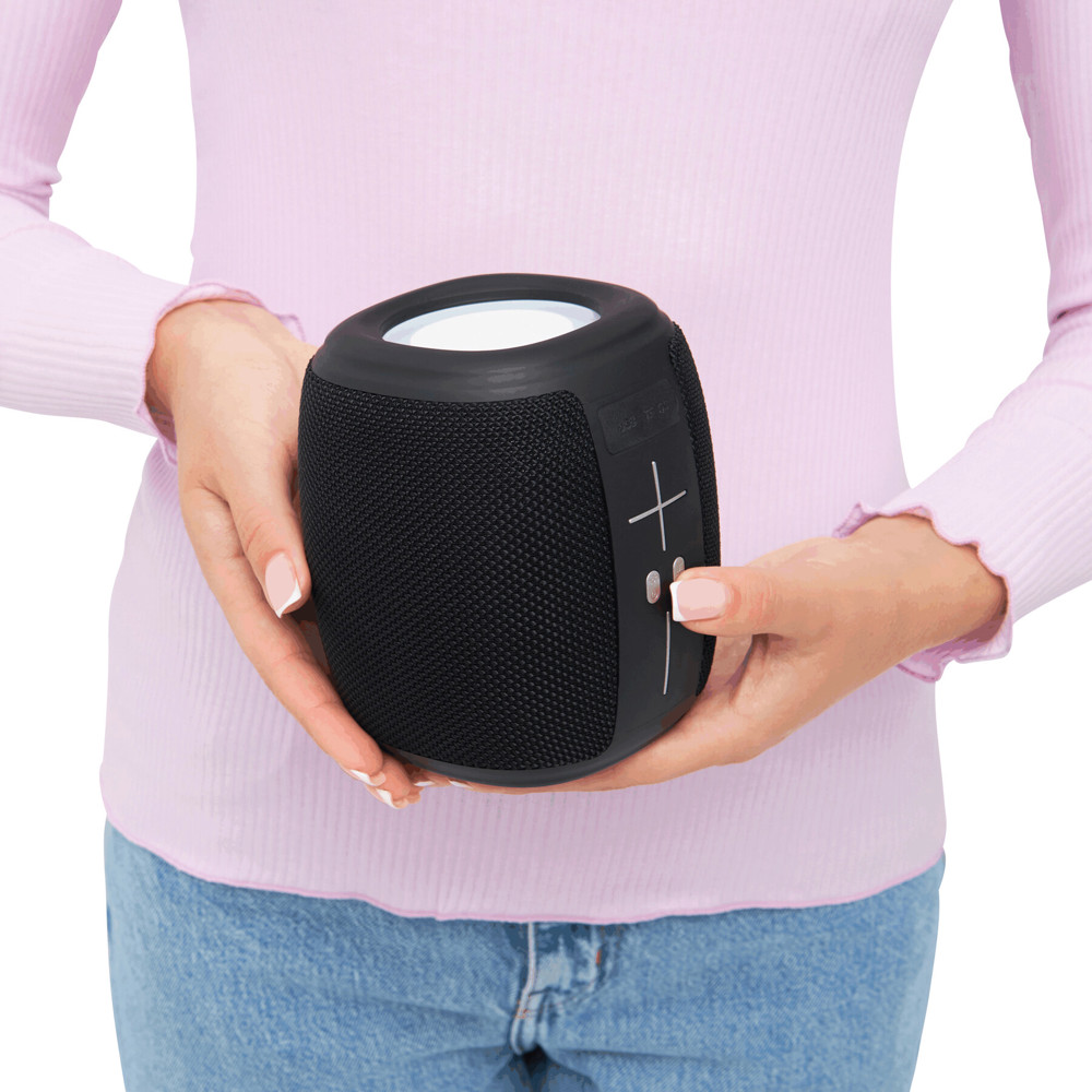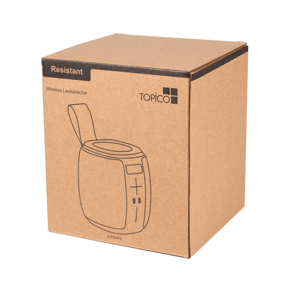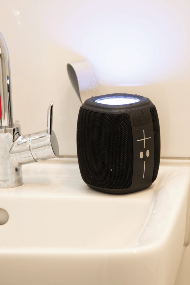 Draadloze luidspreker RESISTANT: Met wisselend, gekleurd licht, spatwaterdicht volgens IPX4, muziekvermogen 1x10 watt, voor aansluiting op mobiele telefoon, tablet enz., MP3 kan worden afgespeeld via USB en miroSD-kaart, handsfree voorziening, krachtige batterij, capaciteit: 1.200 mAh, looptijd: ca. 2-3 uur, oplaadtijd: ca. 2 uur, max. bereik: ca. 10 m, incl. USB-oplaadkabel met USB type C-connector (lengte: ca. 49 cm), grijze draagriem, 2 antislipvoetjes