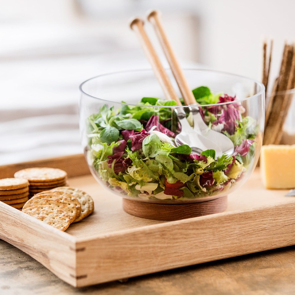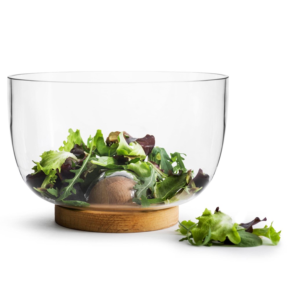 Deze ronde afneembare glazen schaal, vormt samen met de, massief eikenhouten voet, een fantastisch geheel. Door het strakke, maar ook klassieke design, past deze combinatie in bijna elk interieur. Perfect voor salade of fruit. Vergeet niet de bodemplaat regelmatig te oliën. Luxe verpakt in giftbox.