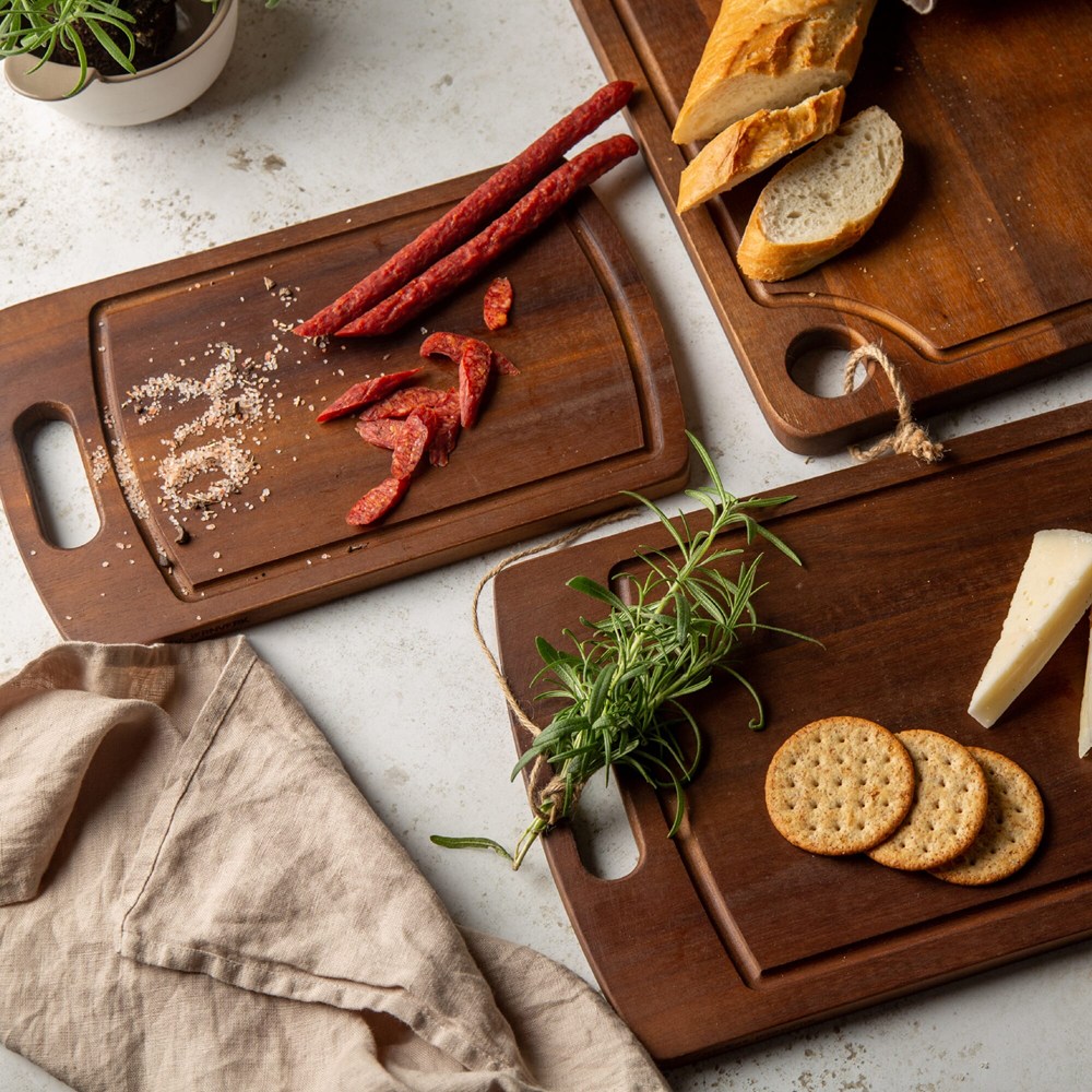 Set van 2 snijplanken in prachtig acaciahout van het Zweedse merk Orrefors Jernverk. De houten snijplanken mogen absoluut niet ontbreken in de keuken. De snijplanken hebben een stevig handvat aan het korte uiteinde en een inkeping bovenop die vloeistof opvangt. Deze snijplanken zijn licht en daarom makkelijk in gebruik. Het acaciahout geeft ze ook nog eens een mooie glans.