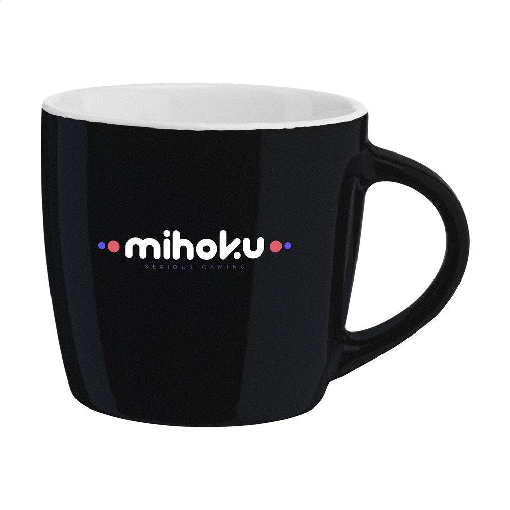 Keramische kwaliteitsmok met gekleurde buitenzijde en royaal oor. Inhoud 340 ml. Vaatwasserbestendig. De opdruk is vaatwasmachine getest en gecertificeerd: EN 12875-2.
