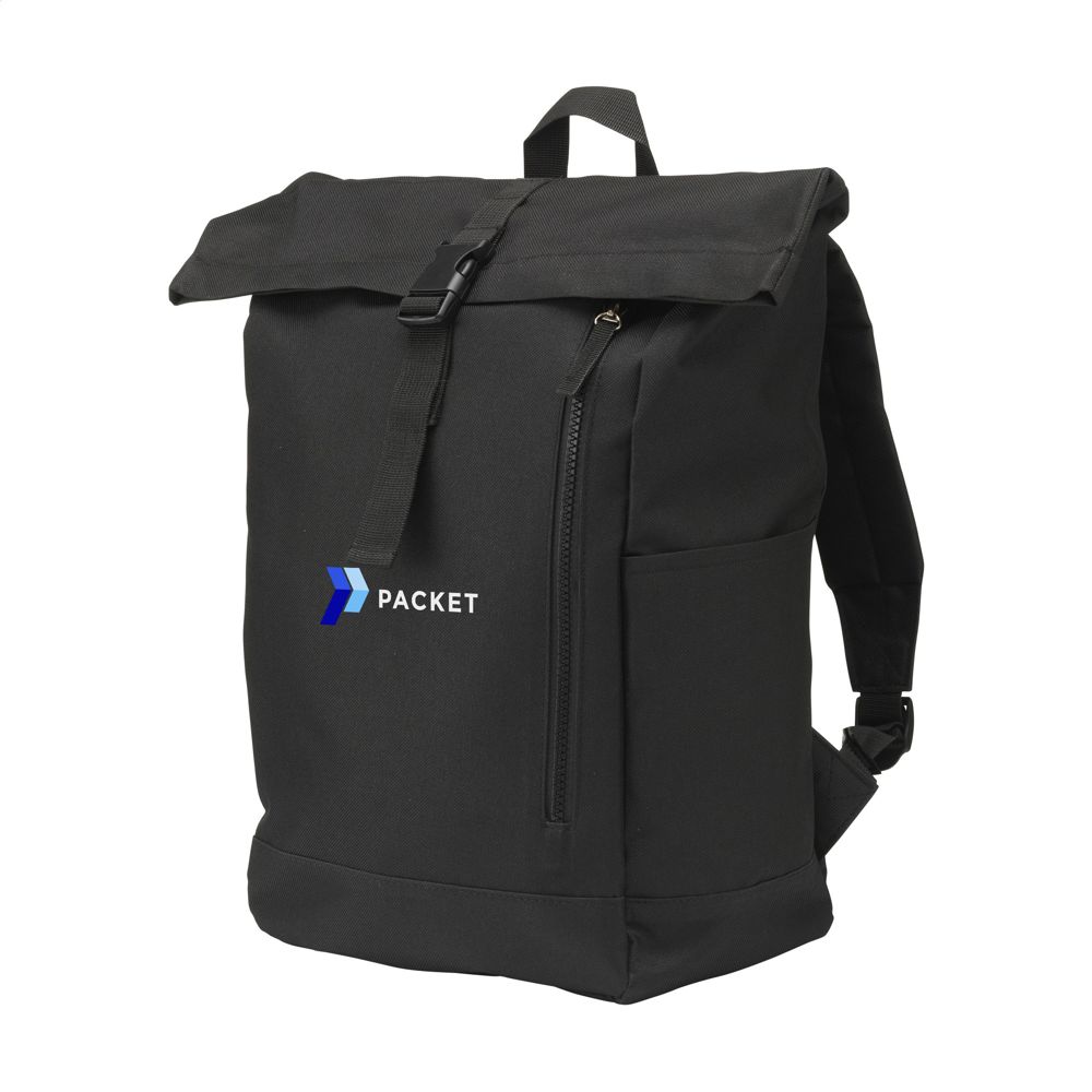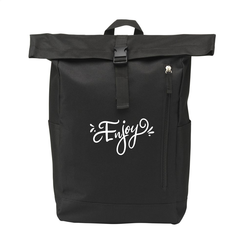 Stoere, praktische urban ‘roll-top’ rugzak van sterk 600D polyester met waterbestendige PVC binnenzijde, gedeeltelijk nylon gevoerd. De rugzak heeft één groot binnenvak, een insteekvak aan beide zijdes en een groot ritsvak aan de voorzijde. Met foam rugzijde voor meer draagcomfort, gewatteerde, en verstelbare schouderriemen. Met draaglus en een rolsluiting met kliksysteem aan de bovenzijde. De perfecte tas voor dagelijks gebruik. Inhoud ca. 18 liter.