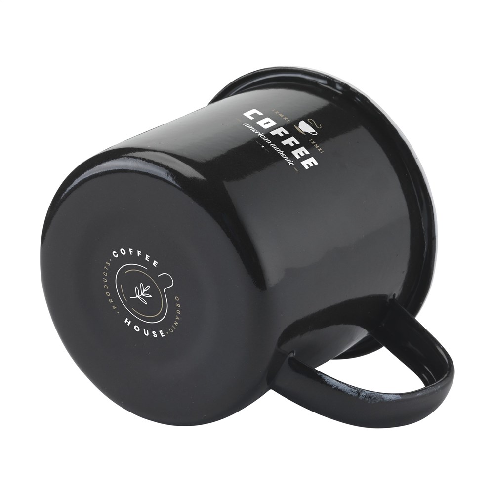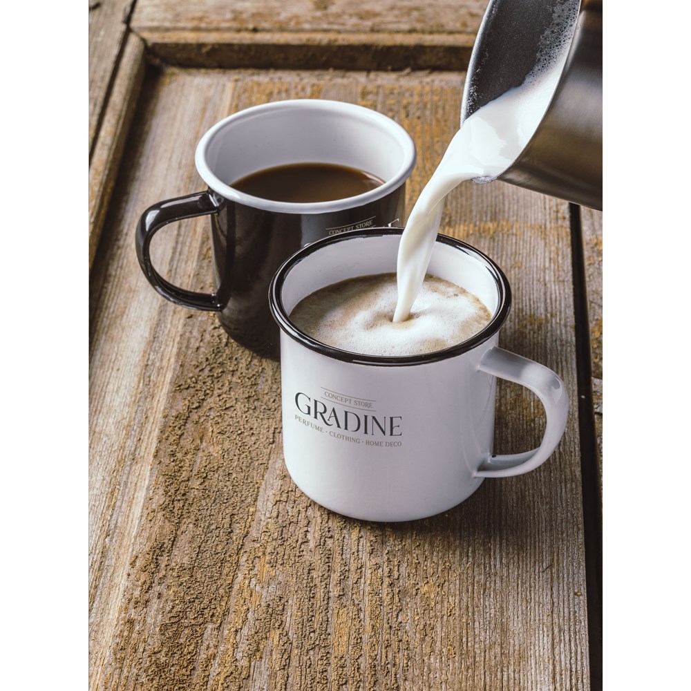 Geëmailleerde mok. Een ontwerp in populaire retrostijl. Om de retro look te accentueren heeft de mok onvolkomenheden. Inhoud 350 ml. Per stuk verpakt.