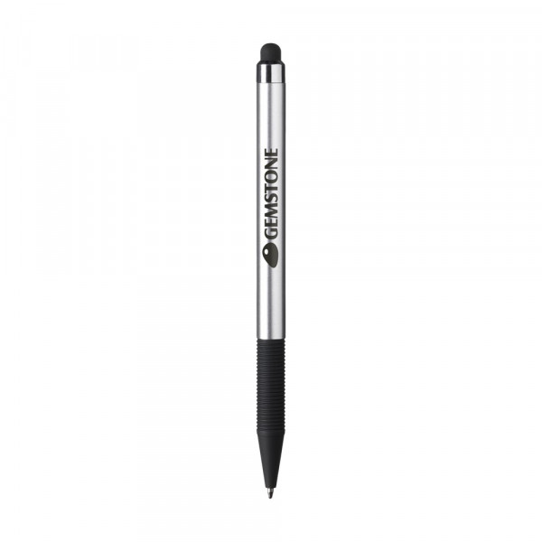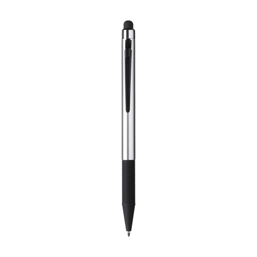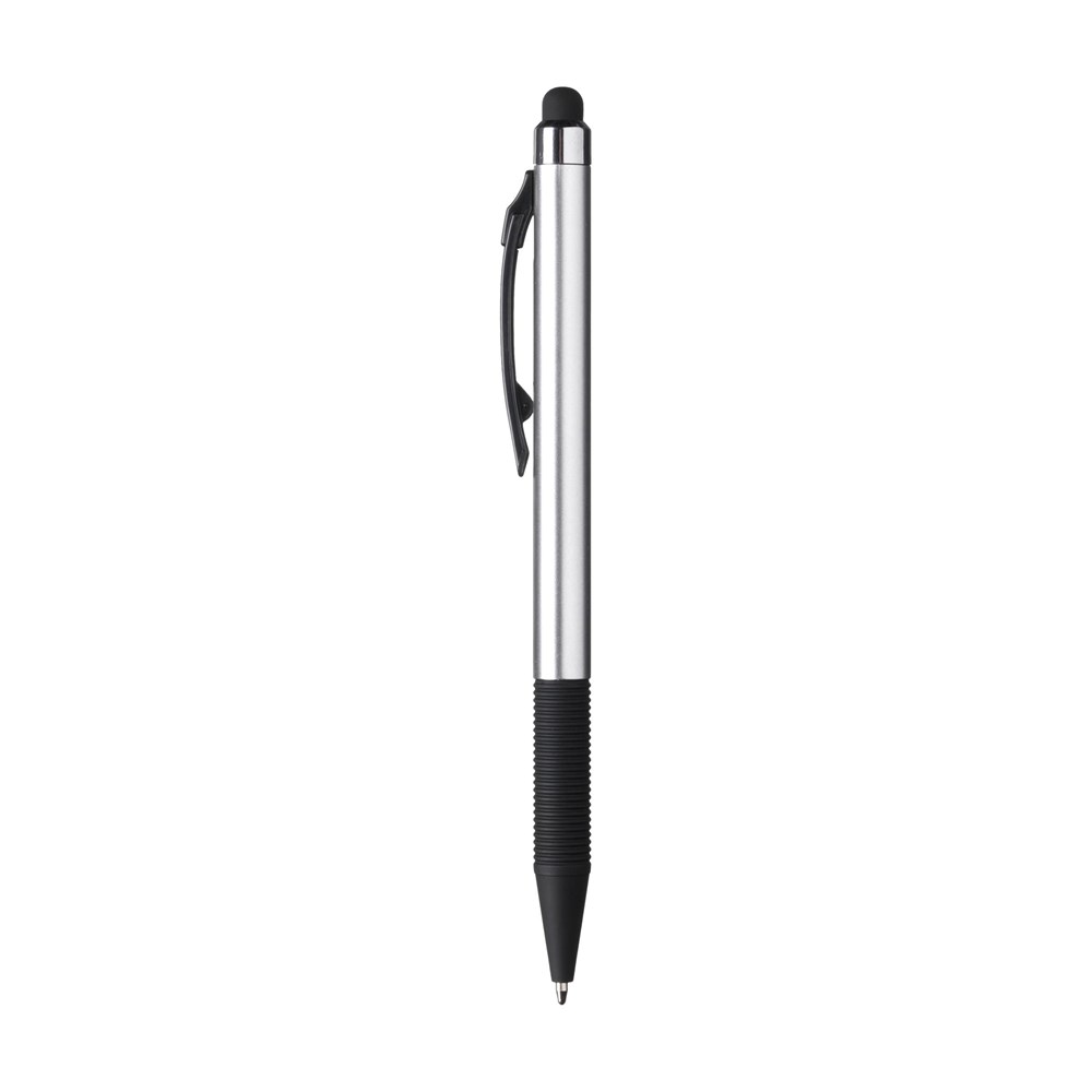 Blauwschrijvende, lichtgewicht balpen met top/pointer voor het bedienen van touchscreens (zoals iPhone/iPad). Slanke houder in metallic look met clip, tevens aan-/uitknop en gripvast, rubberen voorstuk.