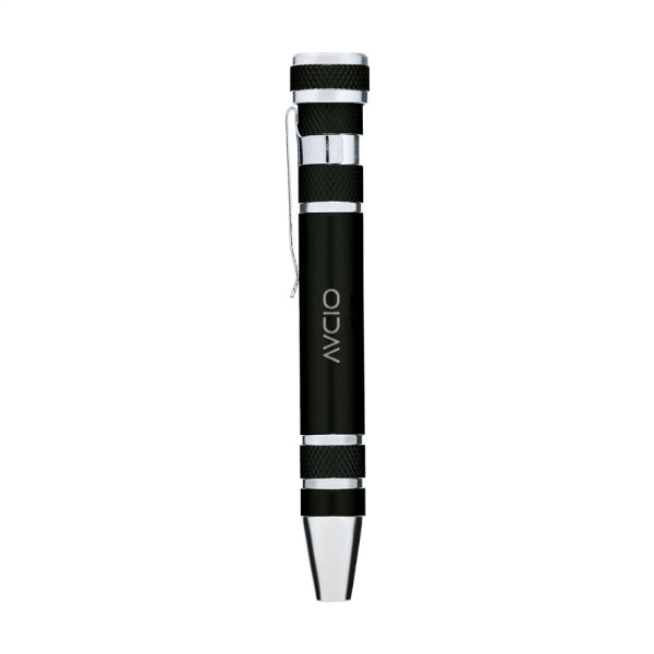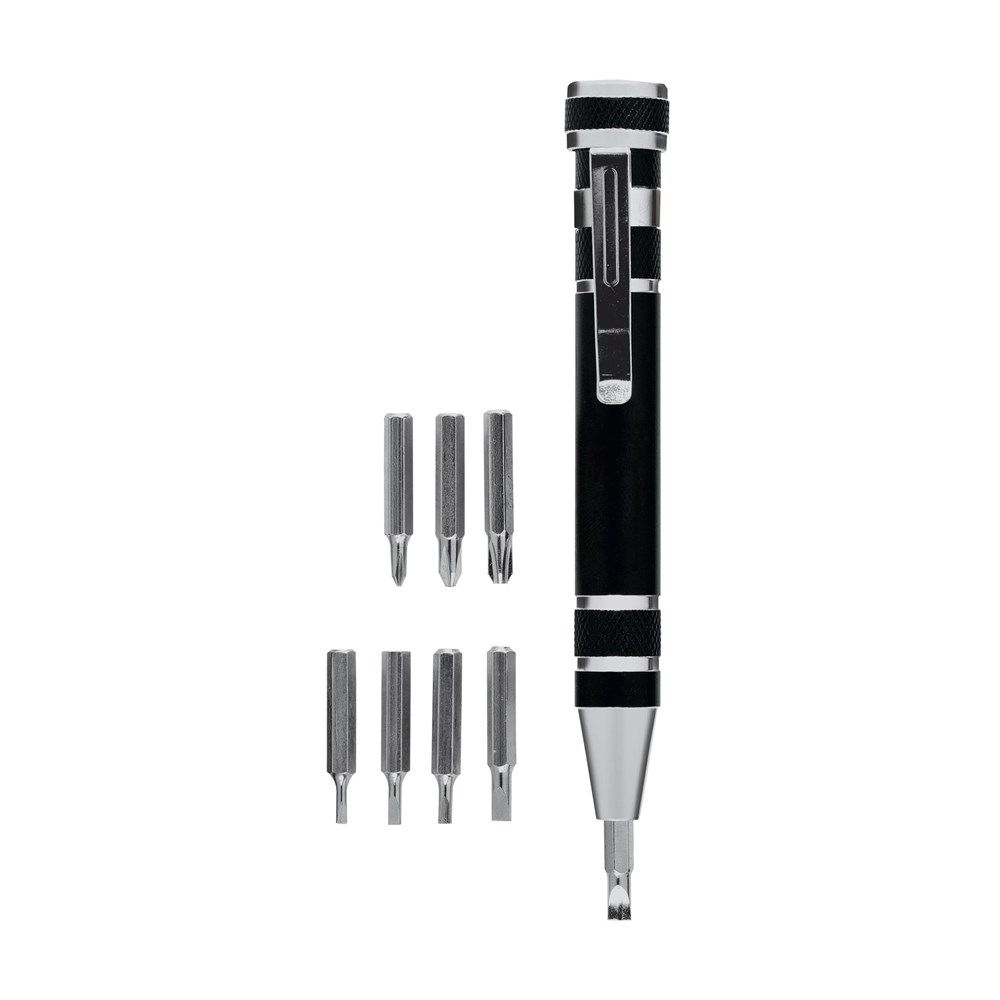 Aluminium bitpen in metallic look. Met stevige clip en 8 bitjes: CRV1.5 - CRV2.0 - CRV3.0 - CRV3.5 - PH000 - PH0 - PH1 - PH2. Per stuk verpakt.