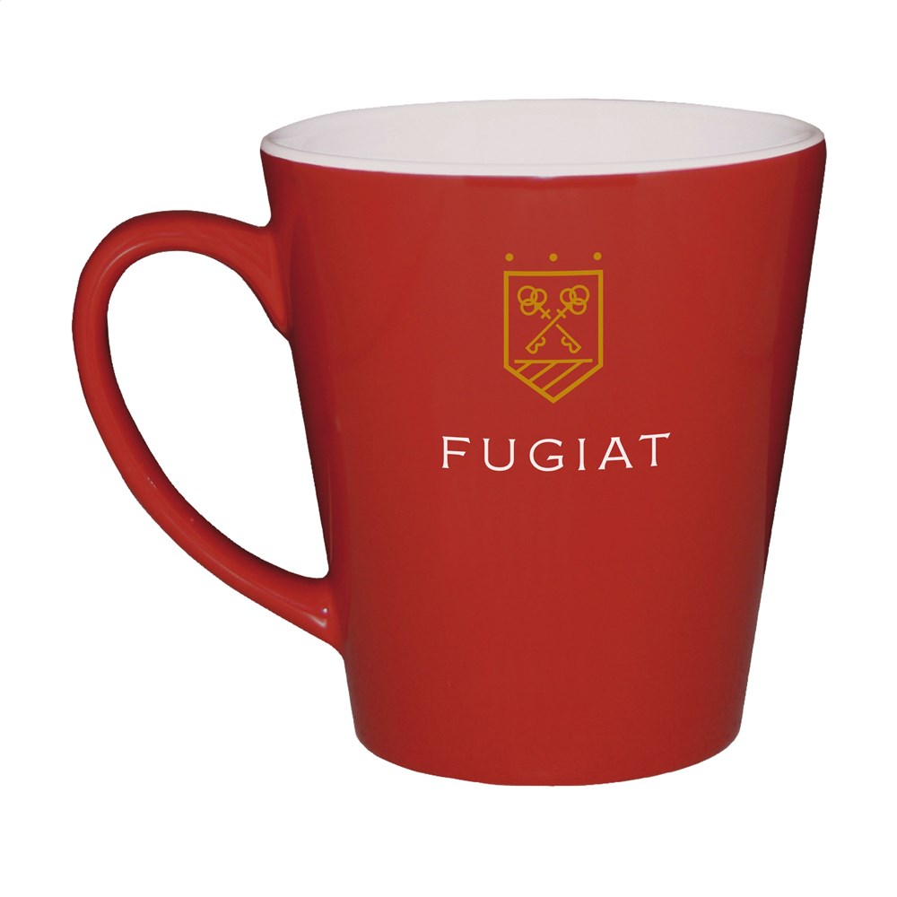 Eigentijdse keramische kwaliteitsmok. In geheel wit óf met gekleurde buitenzijde. Inhoud 310 ml. vaatwasserbestendig. De opdruk is vaatwasmachine getest en gecertificeerd: EN 12875-2.