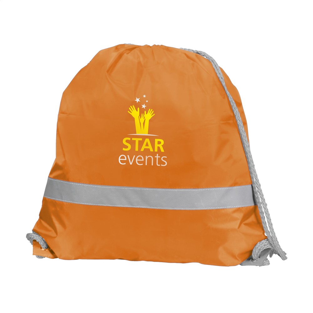 Rugzak van waterafstotend 190T nylon. Met aanrijgkoorden en reflecterende band. Inhoud ca. 8 liter.