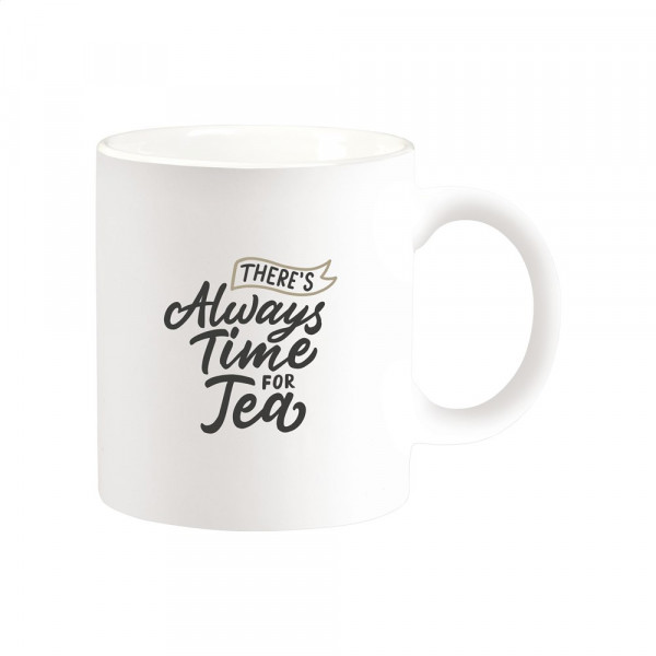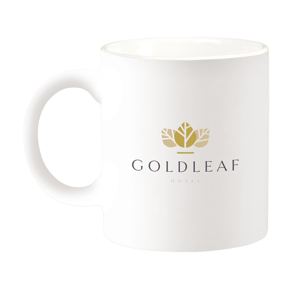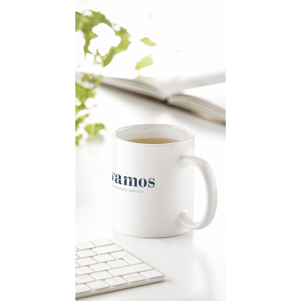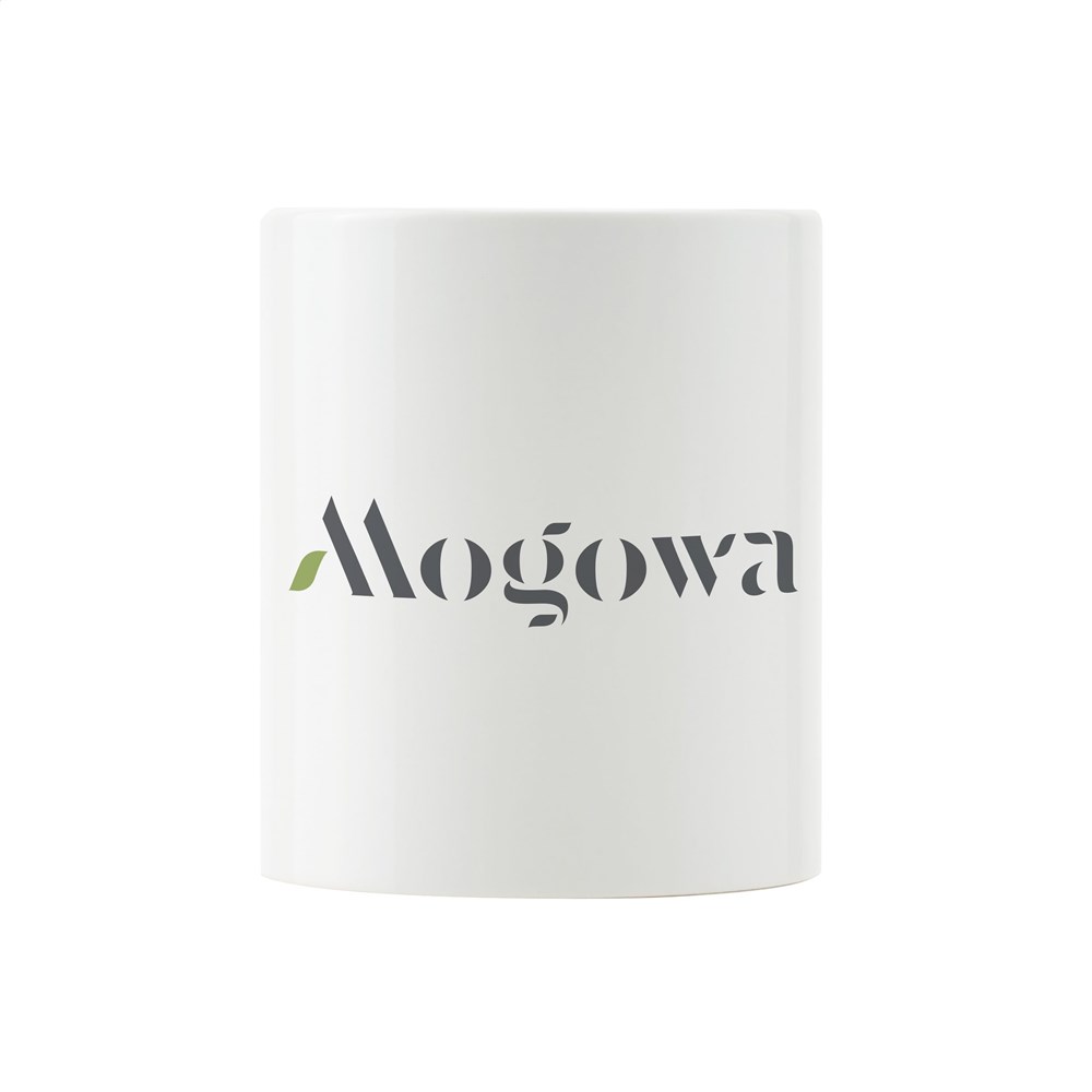 Mok van hoogwaardig keramiek. In geheel wit óf met gekleurde buitenzijde. Vaatwasserbestendig. De opdruk is vaatwasmachine getest en gecertificeerd: EN 12875-2. Inhoud 350 ml.