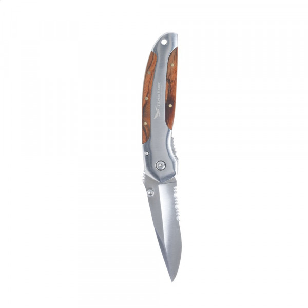 Robuust RVS survivalmes met lemmet voorzien van vlijmscherpe kartelrand, houten inleg in de handgreep en handige bevestigingsclip. Op het bezit en/of dragen van messen of multitools in het openbaar kunnen lokale regels van toepassing zijn. Per stuk in kraft doos.