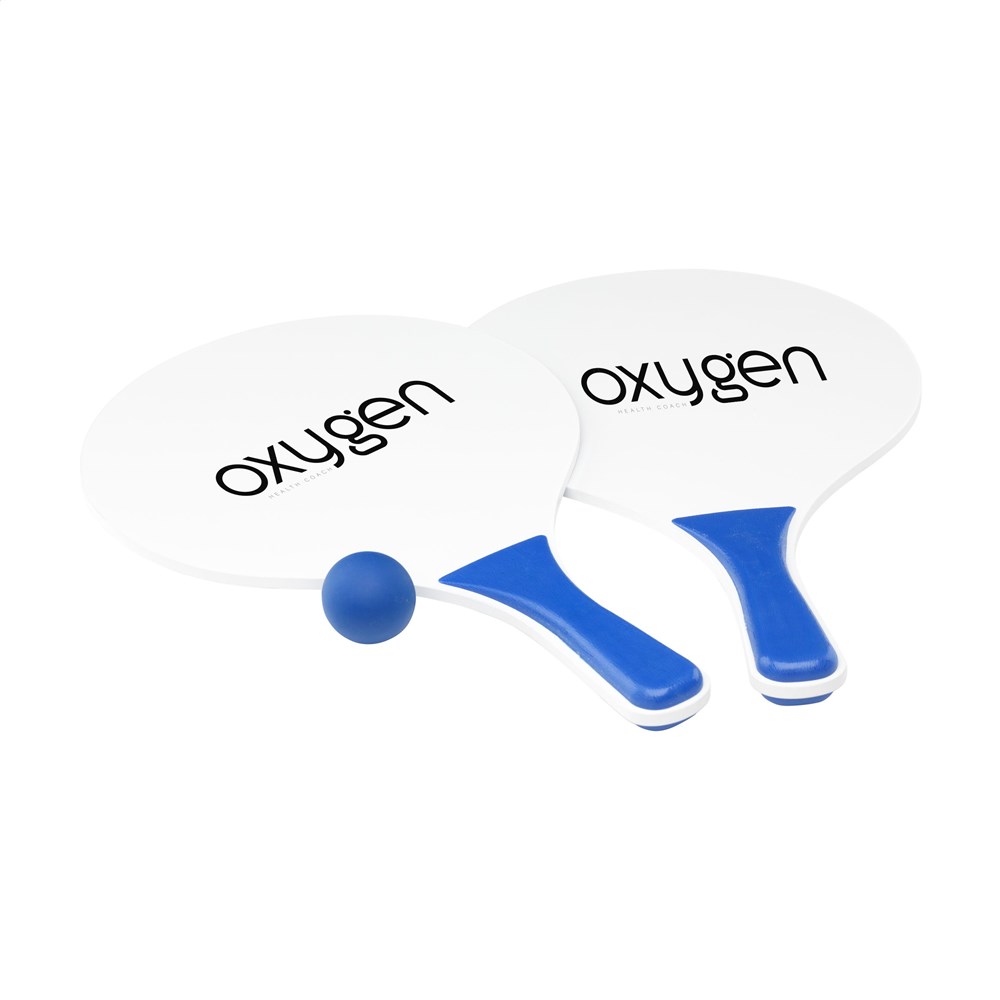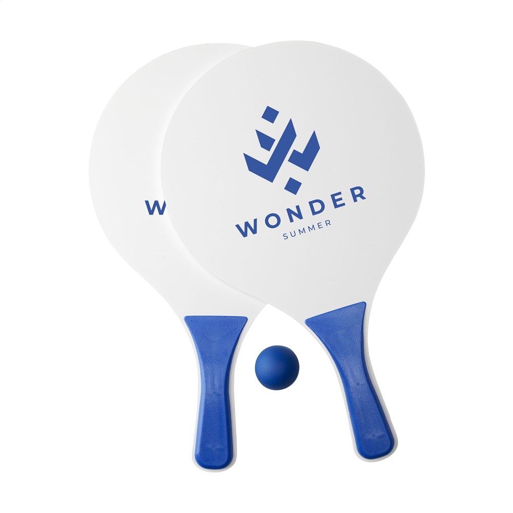 Sportieve strandset: 2 rackets van MDF hout met PP kunststof handgrepen en rubber balletje. Per set in een mesh opbergnet. NOTE: Bij opdruk in 2 kleuren op de rackets is geen perfect pas-/sluitwerk mogelijk - alleen mogelijk als de kleuren elkaar niet raken.