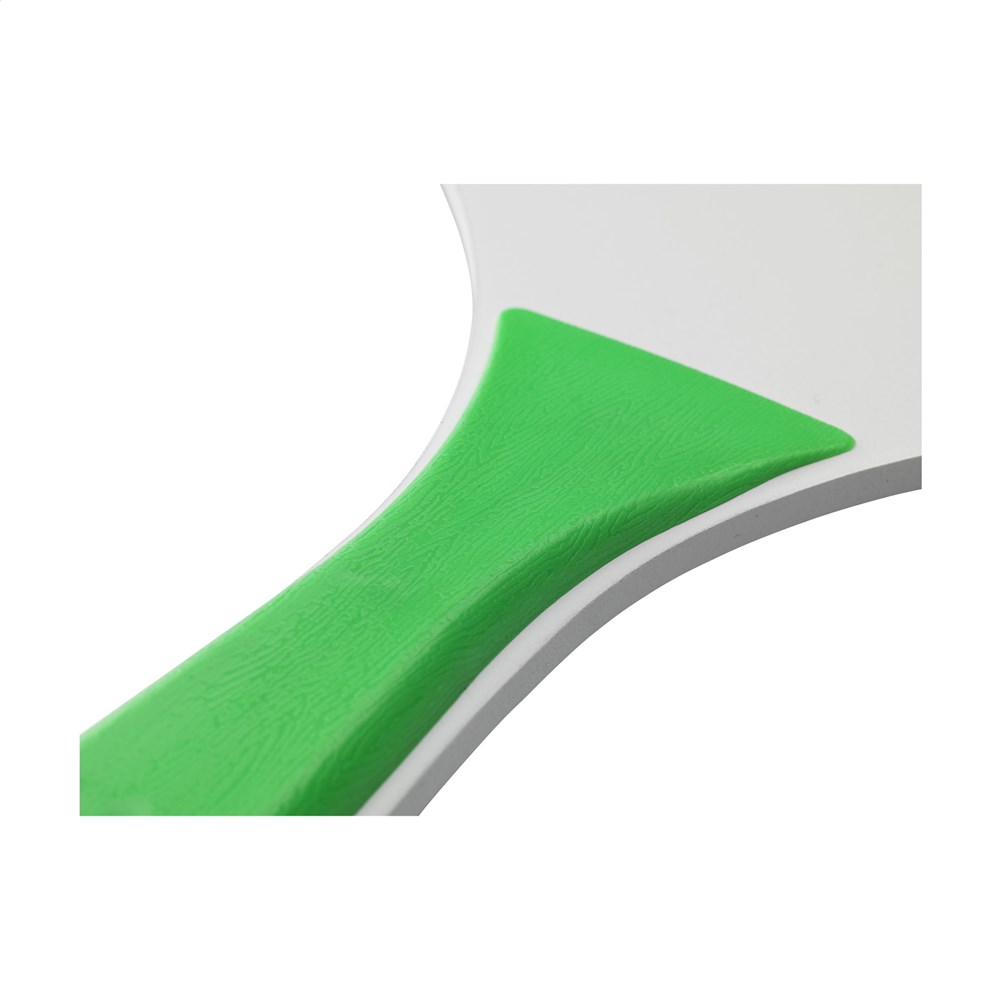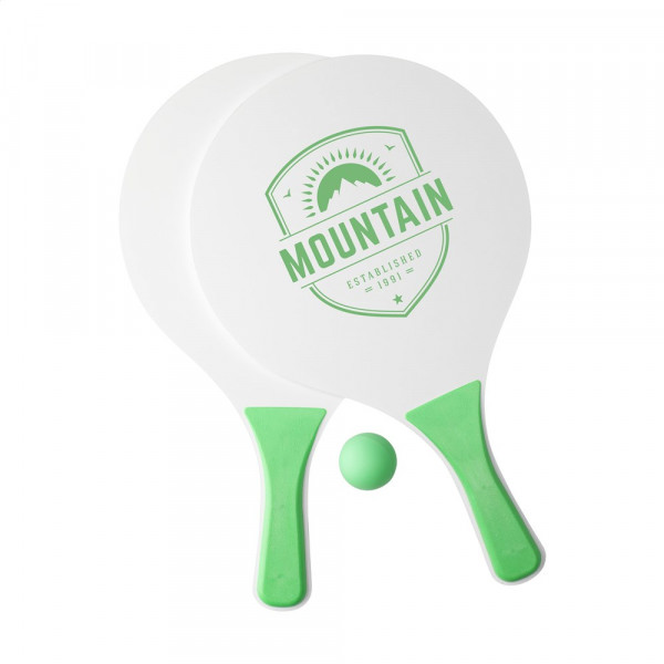 Sportieve strandset: 2 rackets van MDF hout met PP kunststof handgrepen en rubber balletje. Per set in een mesh opbergnet. NOTE: Bij opdruk in 2 kleuren op de rackets is geen perfect pas-/sluitwerk mogelijk - alleen mogelijk als de kleuren elkaar niet raken.