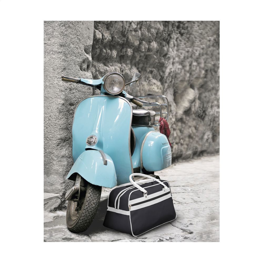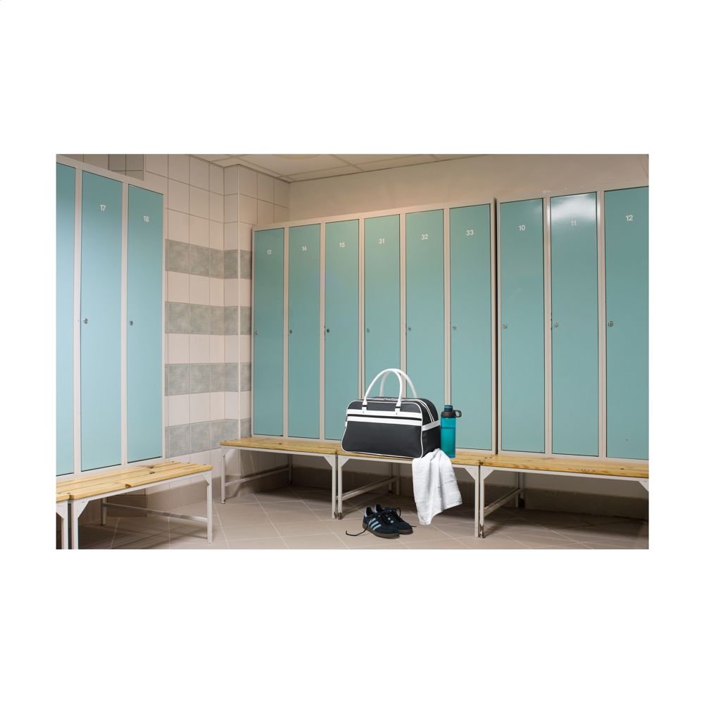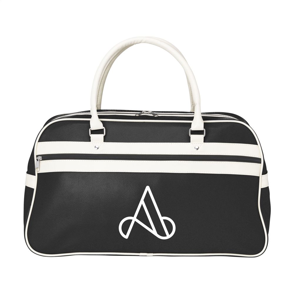 PVC/PU sporttas in jaren '70 look met gevoerde binnenzijde, hoofdvak en ritsvak, 2 stevige handgrepen, inlegbodem en beschermnoppen. Afgewerkt met hoogwaardige materialen die een lange levensduur garanderen. Inhoud ca. 21,5 liter.
