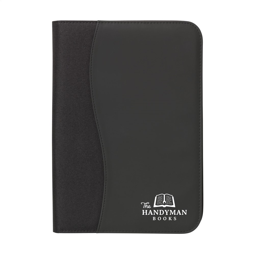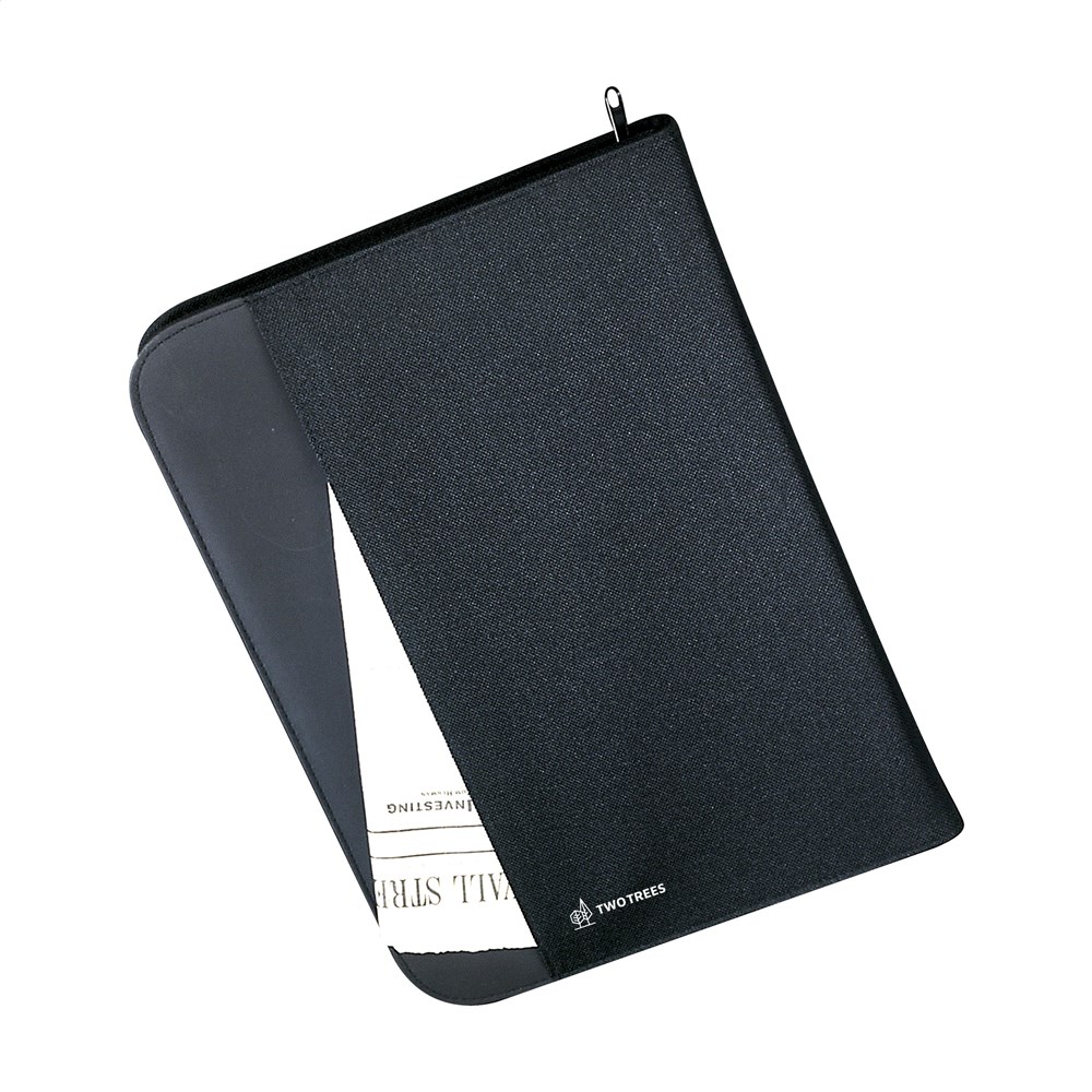 Schrijfmap/documentenmap van 600D polyester/imitatieleer in A4-formaat. Met ruime insteekvakken, extra insteekvak aan de achterzijde en rits rondom. Incl. FSC Mix gecertificeerde schrijfblok en balpen.