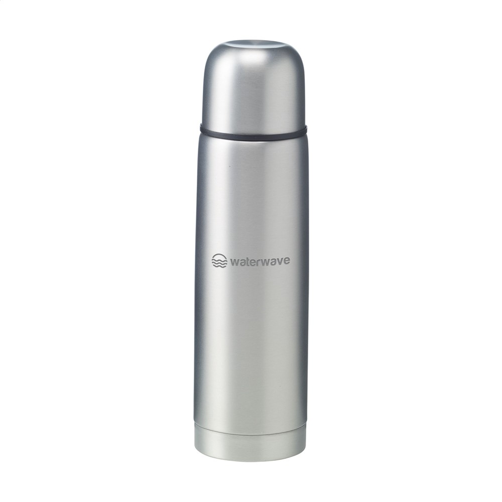 Dubbelwandige, vacuüm geïsoleerde, RVS thermosfles met dubbele schroefdop en een handig schenksysteem met druksluiting. Lekvrij. De dop is ook als drinkbeker te gebruiken. Afgewerkt met frosted, metallic finish. Inhoud 500 ml. Per stuk in kraft doos.