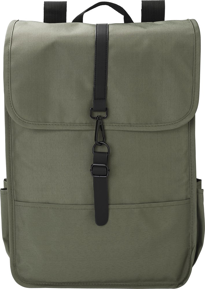 rPET polyester (300D) rugzak met flap. Twee flessenvakken aan de zijkant. Eén groot compartiment. Met zwarte PU band met sluitgesp.