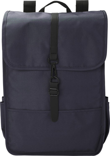 rPET polyester (300D) rugzak met flap. Twee flessenvakken aan de zijkant. Eén groot compartiment. Met zwarte PU band met sluitgesp.