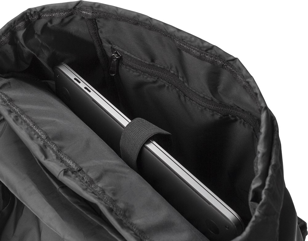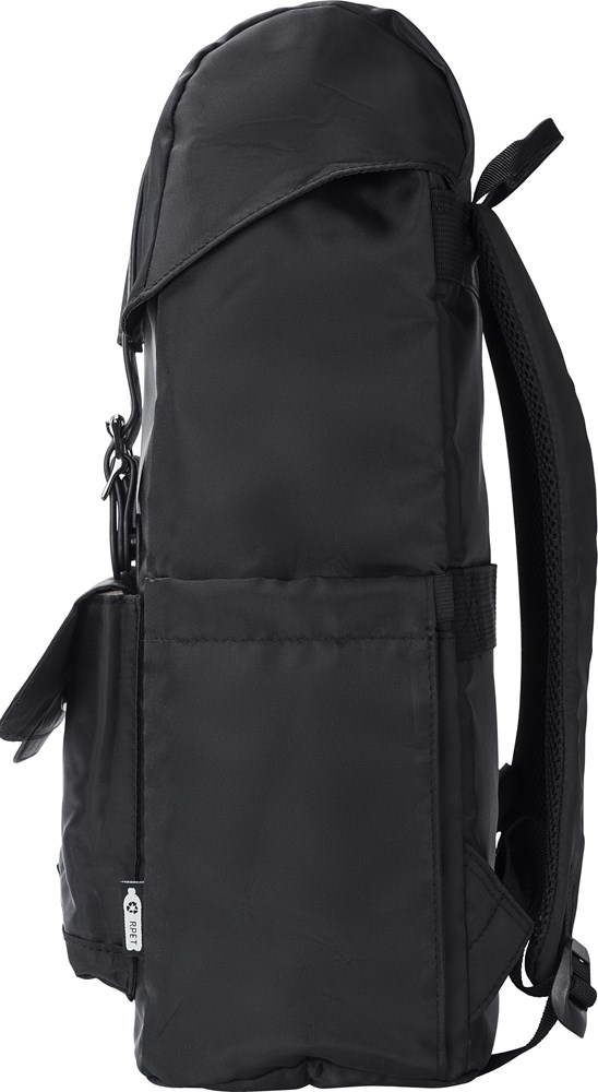 rPET (290T) polyester keperstof rugzak met flap en PU-banden. Twee flessenvakken aan de zijkanten. Zak met magneetsluiting aan de voorkant. Trekkoordsluiting voor binnenzak. Laptop (15 inch) en normaal pokdalig. Trolleyband aan de achterkant. Waterafstotende coating.