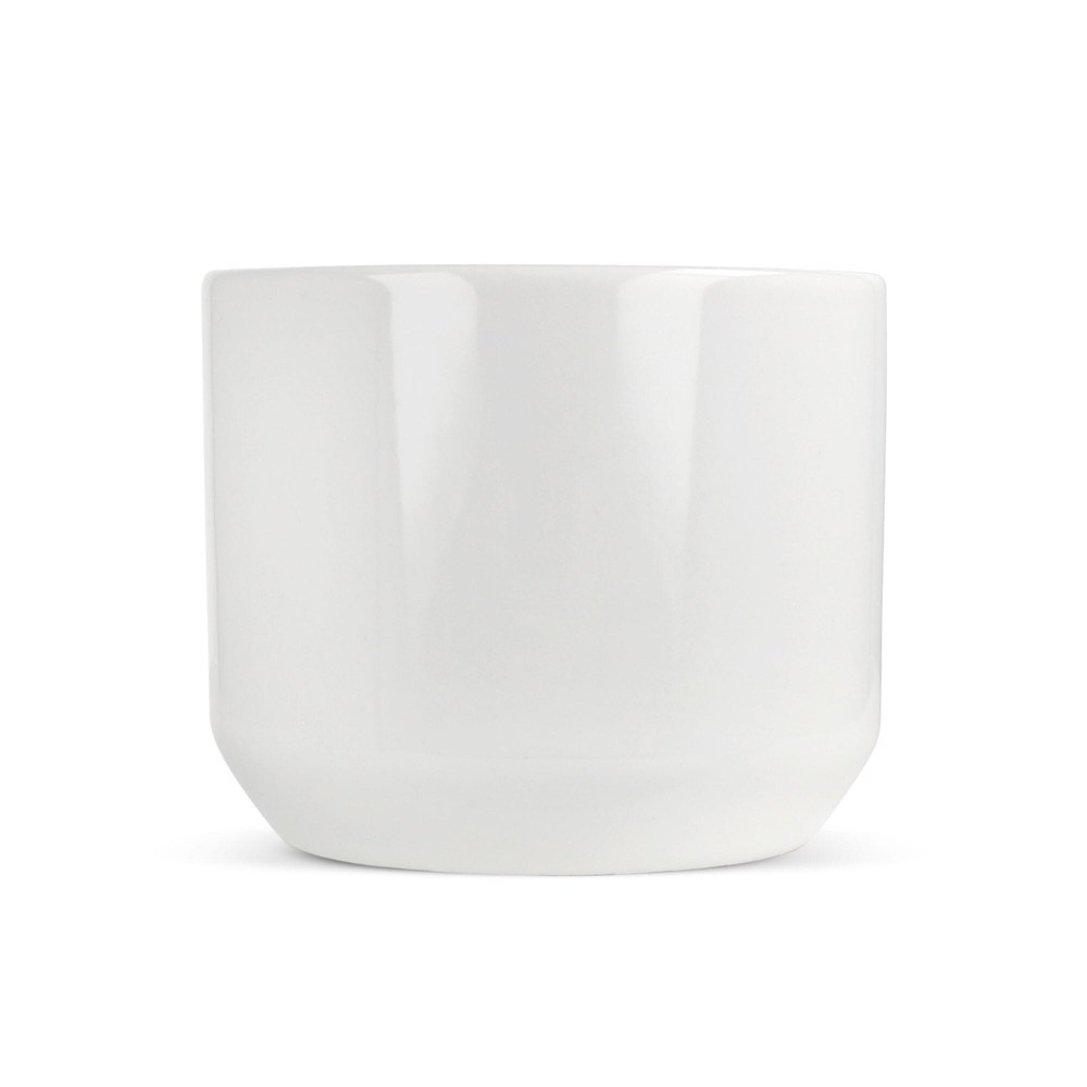 Witte mok van porselein. Strakke stijl met een compact handvat.