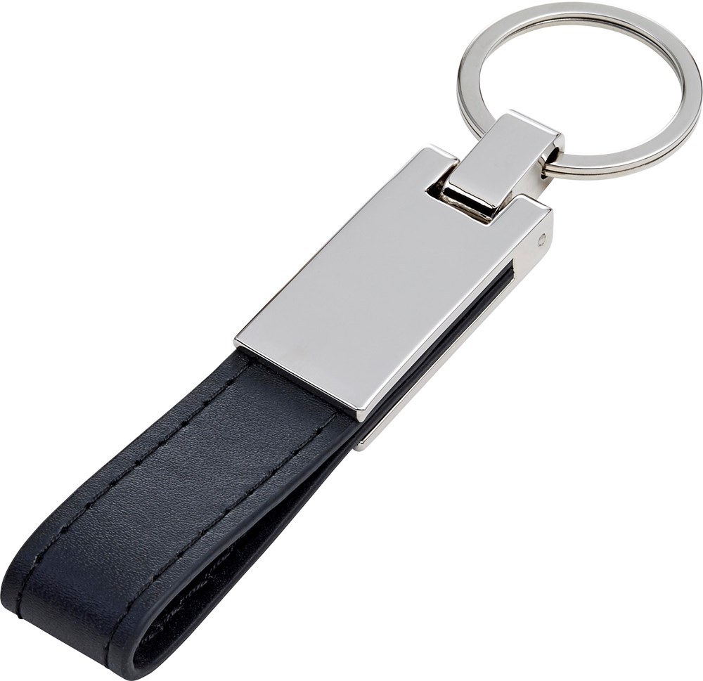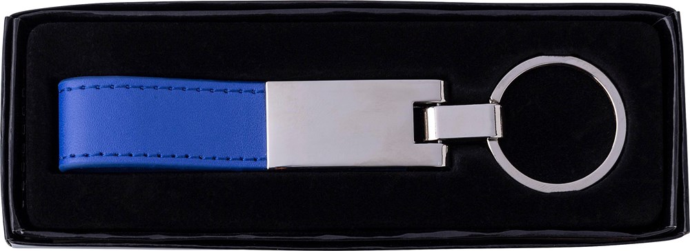 Verzilverde stalen sleutelring met PU lus. Verpakt in een cadeaudoos.