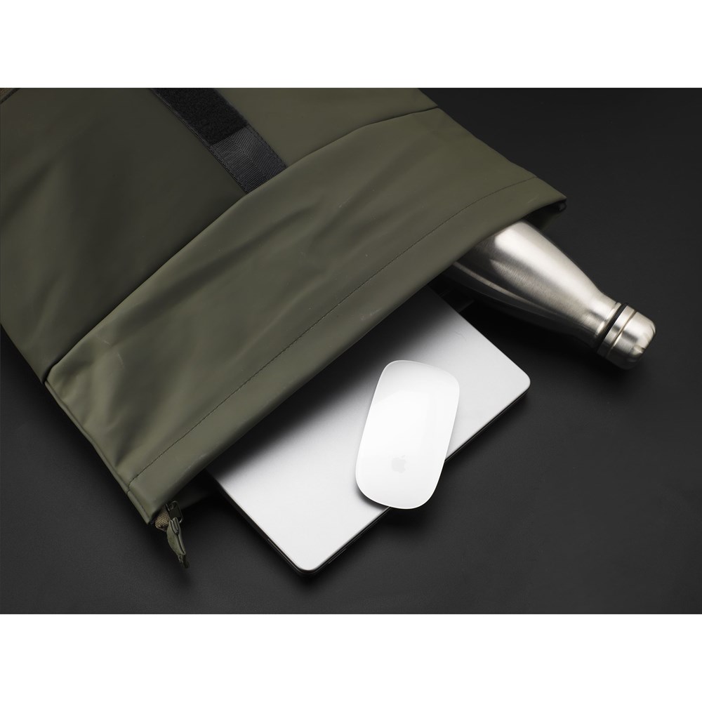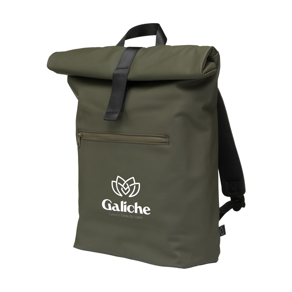 Praktische, stevige en royale ‘roll-top’ laptoprugzak met extra ritsvak aan de voorzijde. Deze rugzak heeft aan de bovenzijde niet alleen een handige rolsluiting met klittenband maar ook een ritssluiting. Deze rugzak is gemaakt van waterafstotend PU, 5% gerecycled PU en 42% gerecycled polyester. De rugzak heeft een keurig afgewerkte voering van gerecycled PET en is van alle gemakken voorzien. Het royale binnenvak heeft een speciaal laptopcompartiment voor het veilig vervoeren van een laptop (tot 15.6 inch) of tablet. Verder vind je aan de binnenzijde verschillende insteekvakken voor het georganiseerd opbergen van een mobiel, schrijfwaren of andere accessoires. Door gebruik te maken van de elastieke band aan de binnenzijde blijft een drinkfles rechtop op zijn plek staan. Met handige draaglus. Voor extra draagcomfort zijn de rugzijde en verstelbare schouderbanden voorzien van zacht foam. Deze rugzak is perfect voor dagelijks gebruik en neem je gemakkelijk mee naar school of naar je werk. RCS-gecertificeerd. Totaal gerecycled materiaal: 47%. Inhoud ca. 19 liter.