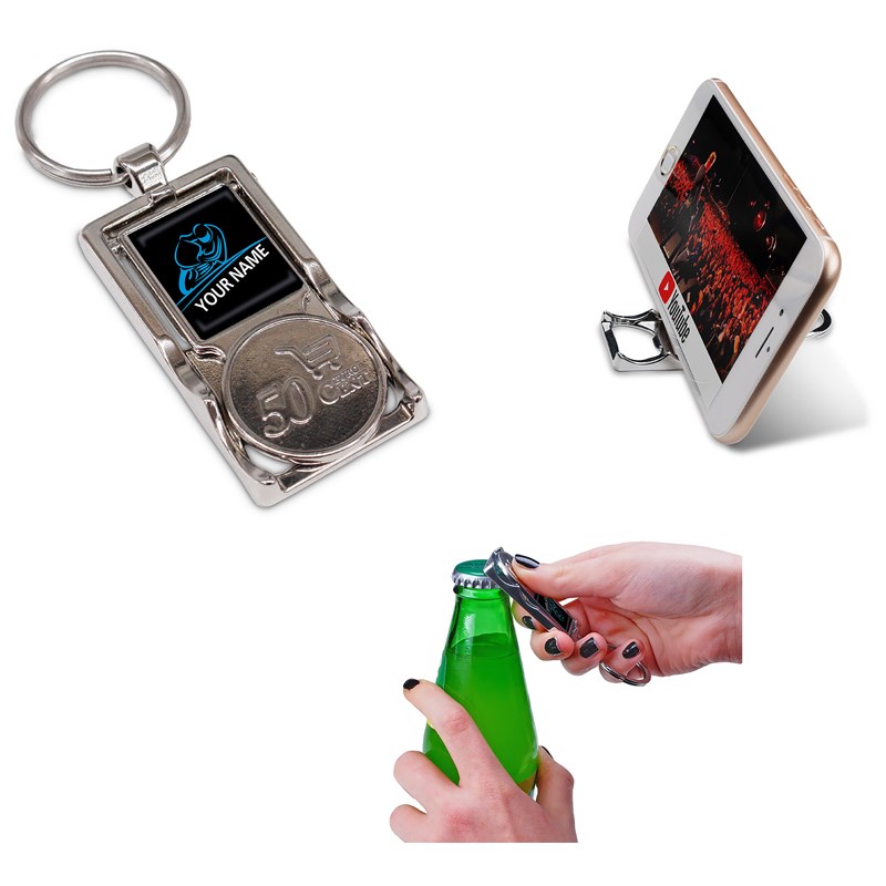 Sleutelhanger met 4 functies. Sleutelhanger, flesopener, wikelwagenmuntje en telefoonhouder. Kan worden voorzien van full color doming.