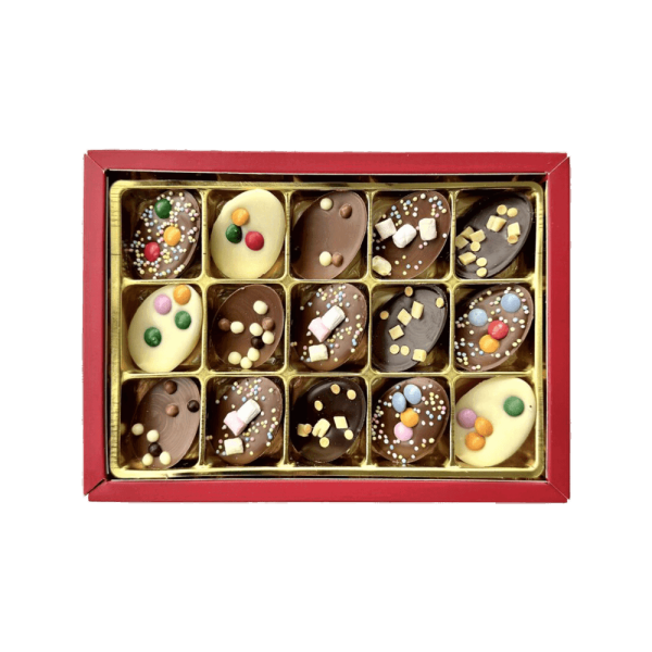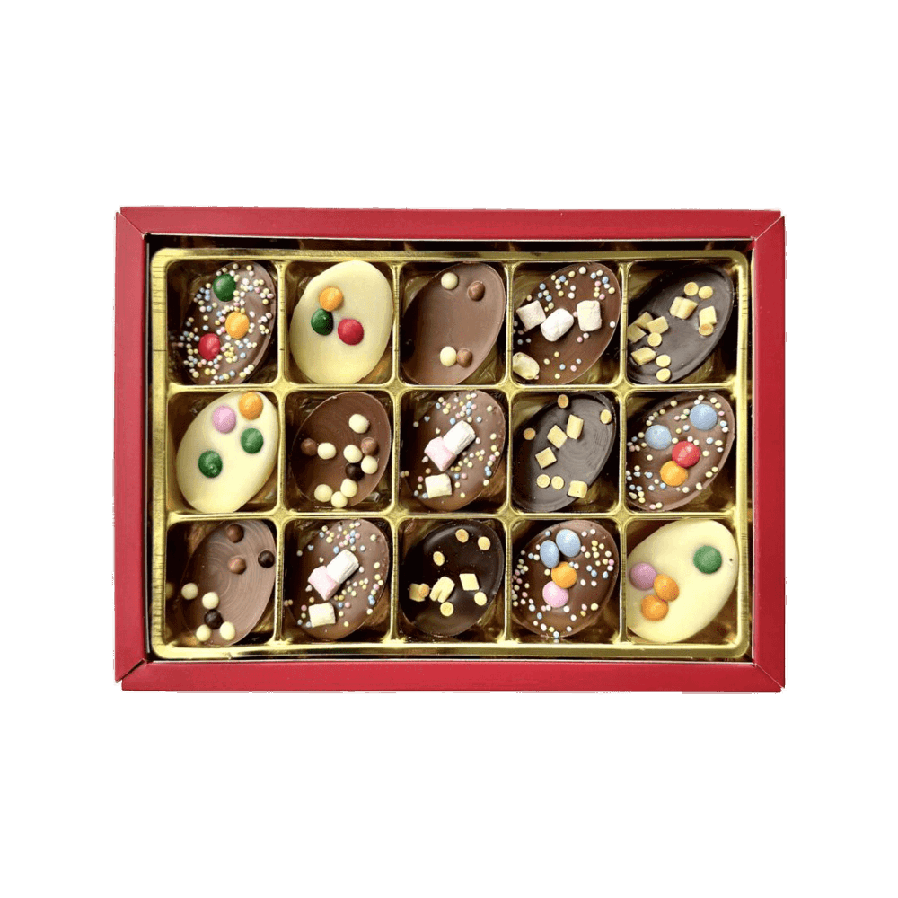 Halve, massieve paaseitjes, voorzien van een decoratieve topping; leuk én lekker. Wat een paasgeschenk. Een topping in frisse voorjaarskleuren: mini smarties, karamelblokjes of mini marshmallow. Eitjes zijn gemaakt van melk-, witte en pure chocolade.