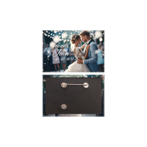 Metalen button, rechthoekig 78x53 mm, achterkant met horizontale speld