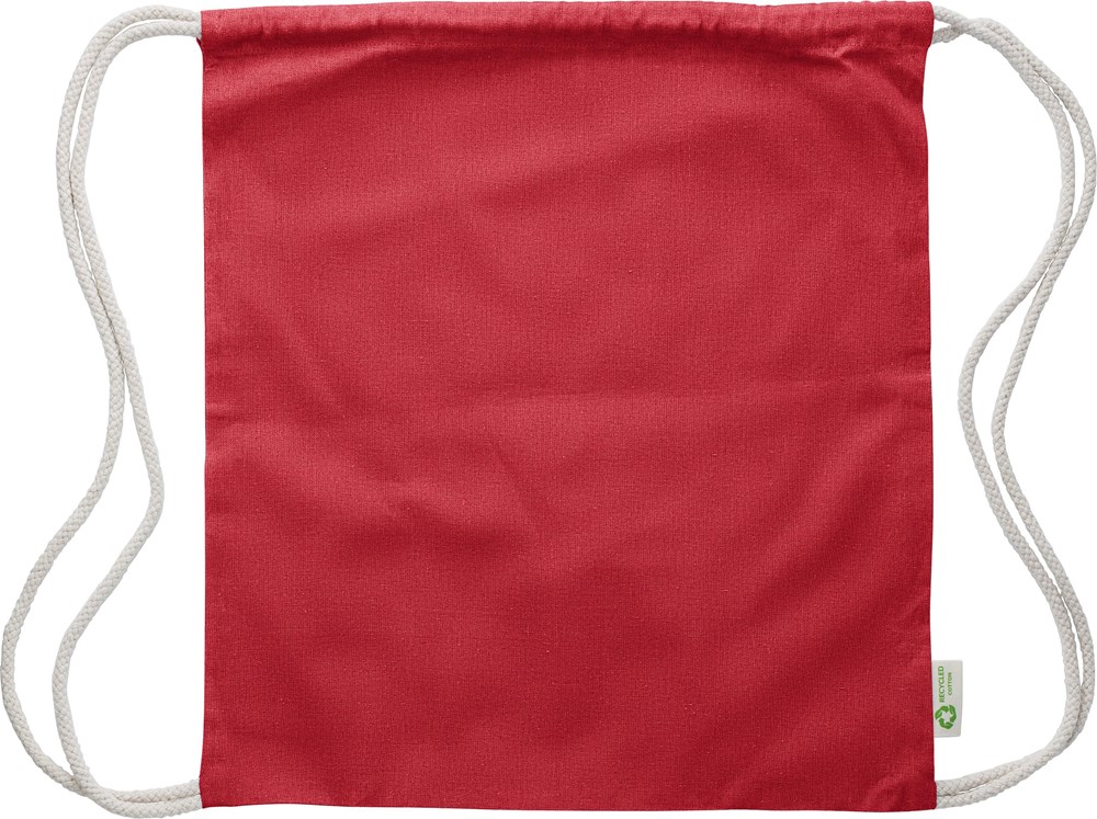 Gerecyclede katoenen trekkoordtas in effen kleur. Stevige koorden en verstevigde hoeken. Gemaakt van 100% gerecycled katoen.