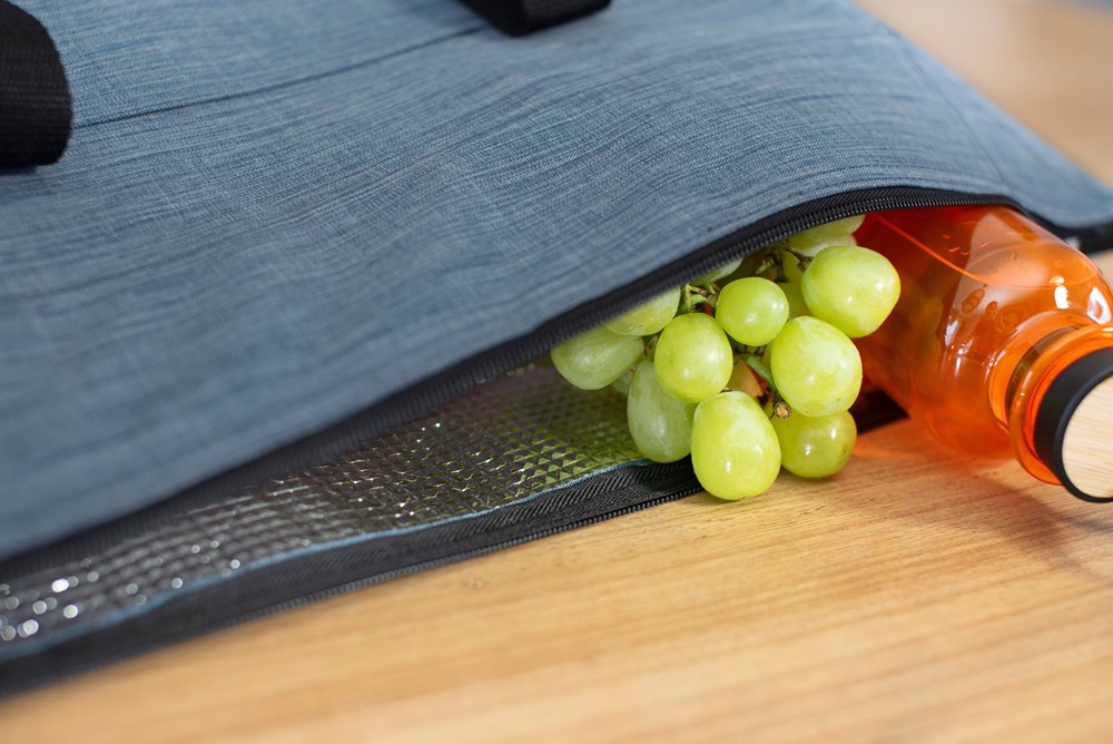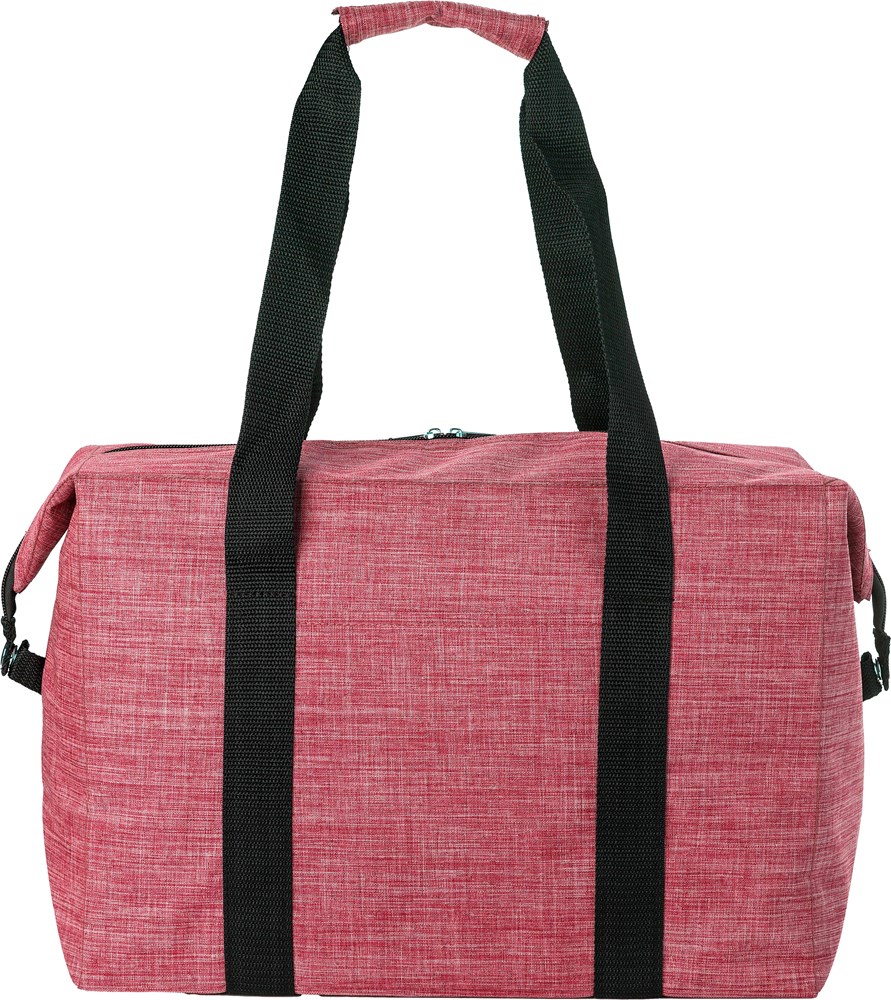 600D polyester koeltas. Eén groot compartiment en één klein vak aan de voorkant. Twee korte draagriemen met klittenbandsluiting. Binnenkant is geïsoleerd met schuim en aluminium.