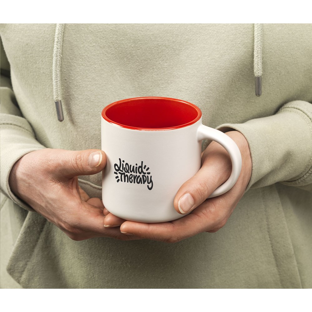 Mok van hoogwaardig keramiek. Afgewerkt met een matte buitenzijde en een gekleurde hoogglans binnenzijde. Vaatwasserbestendig. Inhoud 330 ml.