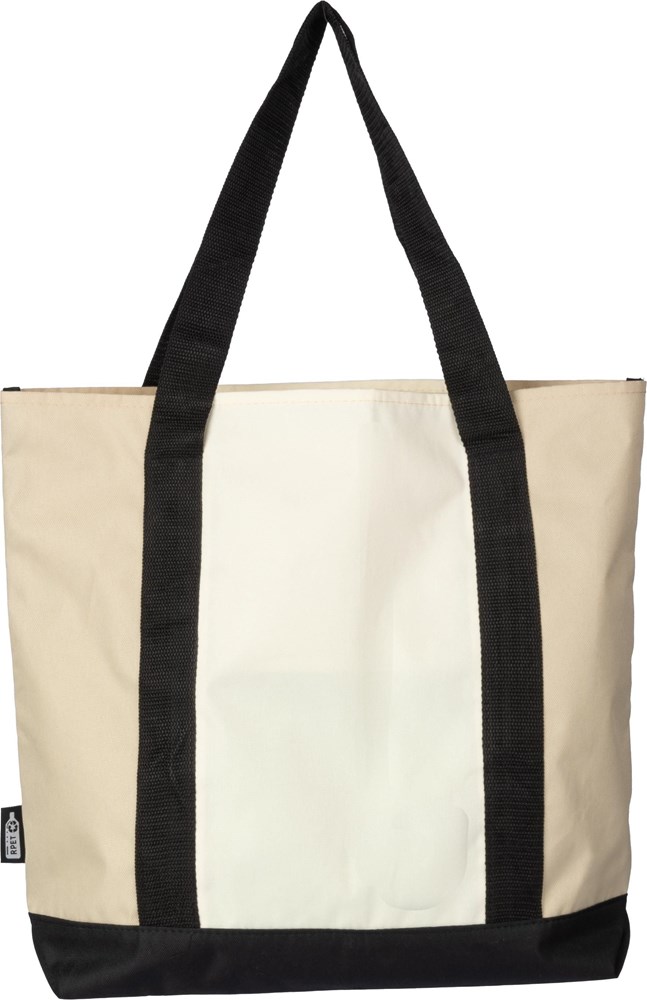 rPET (600D) draagtas met een groot vak aan de bovenkant en een open vak aan de voorkant. Met lange handvatten.