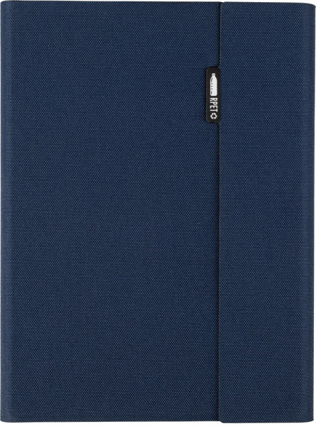 rPET map (ca. A5) met gelaste afwerking. Inclusief notitieboek met 64 gelinieerde pagina’s (70 gram), meerdere vakken en een telefoonhouder. Magnetische sluiting. Individueel verpakt in een kraft hoes.