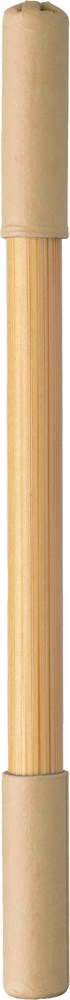 Bamboe balpen en eeuwige potlood. Eén zijde met eeuwige potlood en de andere met balpen, beide met gekleurde kartonnen dop. Blauwe inkt.