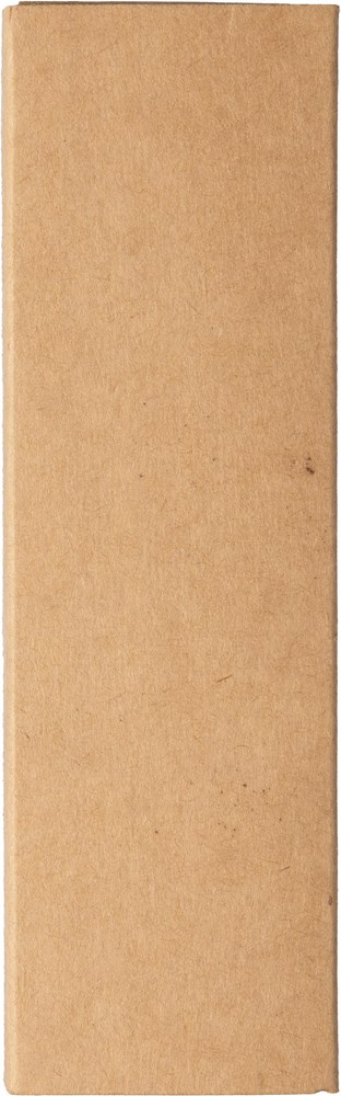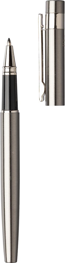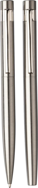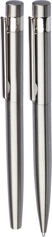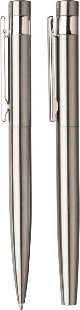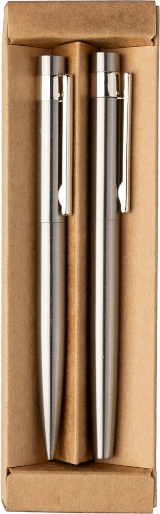 Gerecycled roestvrijstalen schrijfset bestaande uit een draaibalpen en een rollerbal pen, beide met blauwe inkt. Inclusief een gerecycled roestvrijstalen logo op de achterkant van beide pennen. Samen verpakt in een kraftpapieren geschenkverpakking.