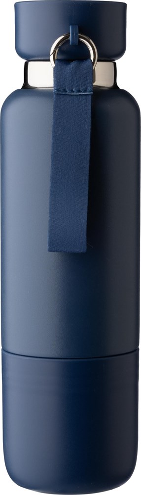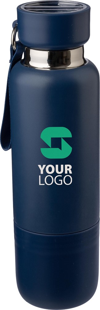 Roestvrijstalen vacuüm dubbelwandige drinkfles (500 ml) met een PP drinkbeker (300 ml) op de bodem. De binnenkant is roestvrij staal 304, de buitenkant roestvrij staal 201. PP deksel met AS transparante sluiting, voorzien van een polyester polskoord en draagriem. Matte kleuren. Individueel verpakt in een bruine kartonnen doos.