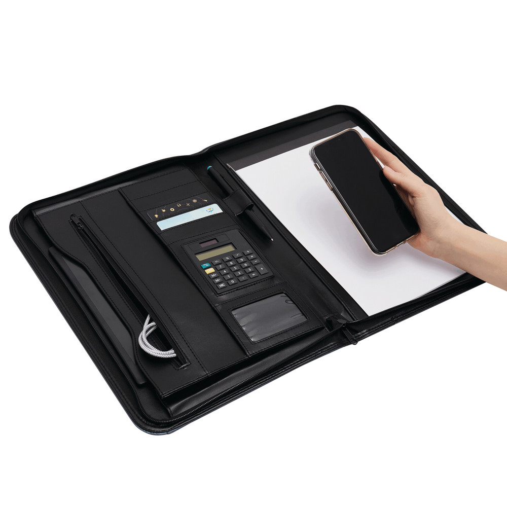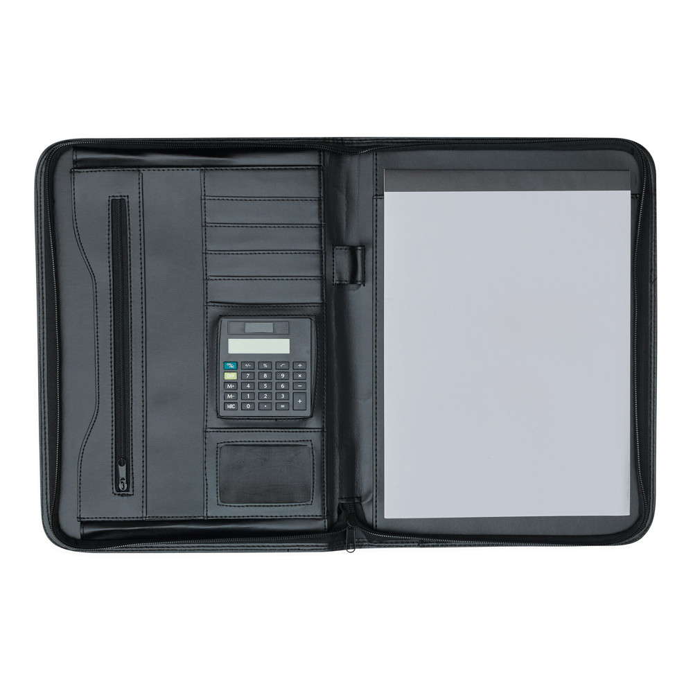 Middels rits afsluitbare A4 schrijfmap GENTLE met blok, diverse insteekvakken, penhouder, rekenmachine en vistitekaarhouders.