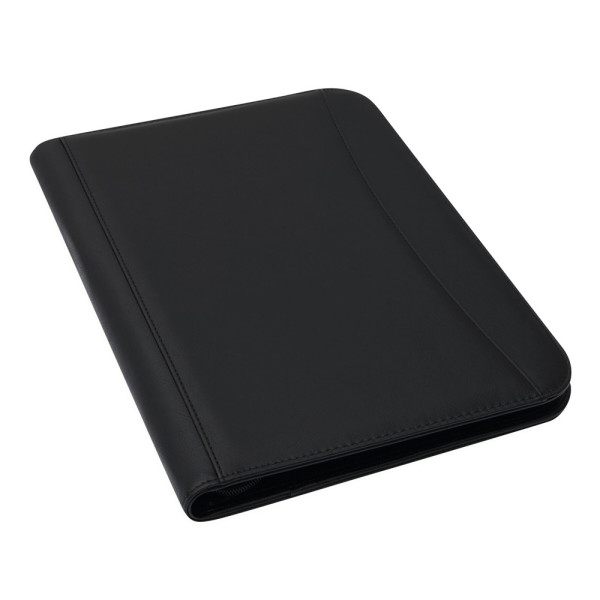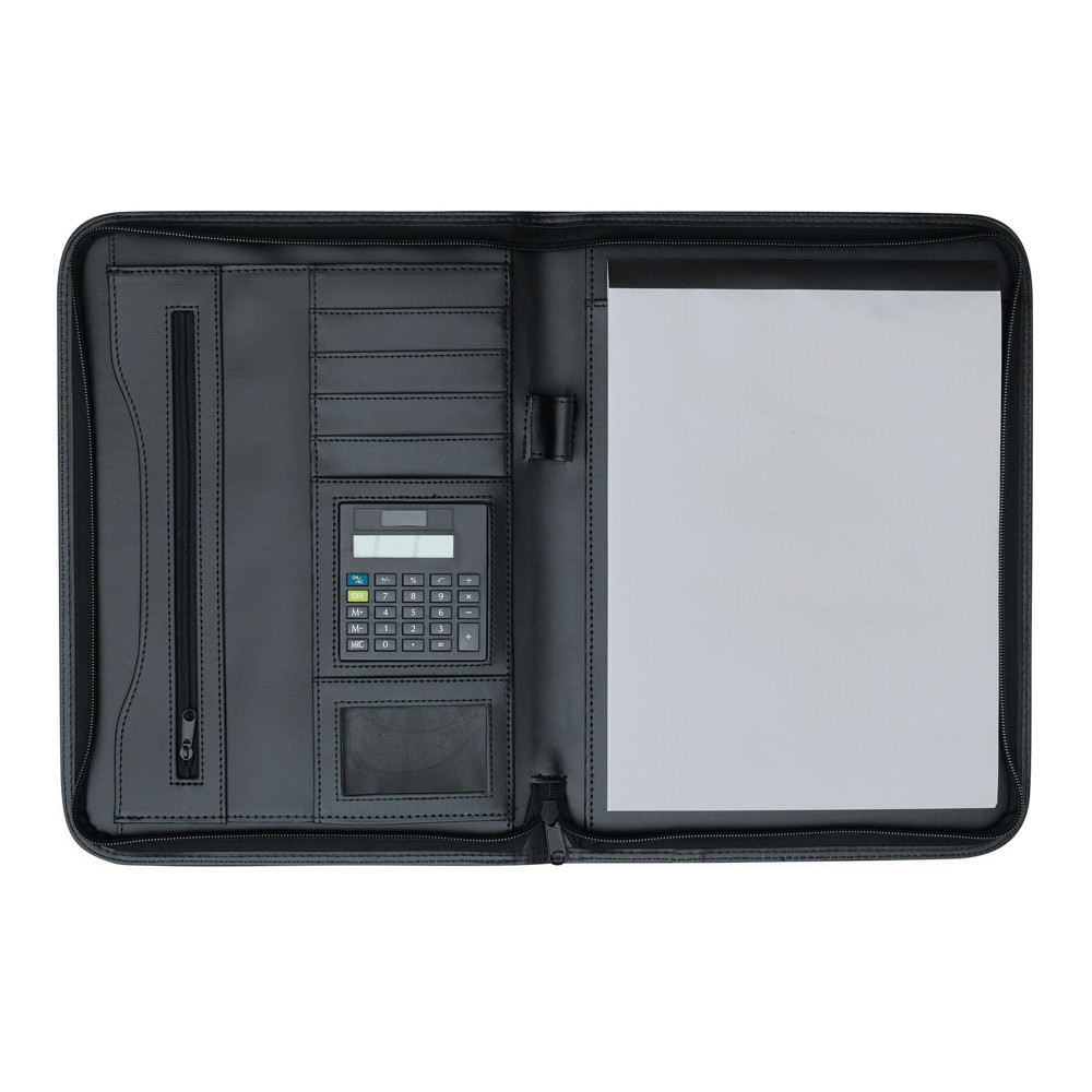 Middels rits afsluitbare A4 schrijfmap GENTLE met blok, diverse insteekvakken, penhouder, rekenmachine en vistitekaarhouders.