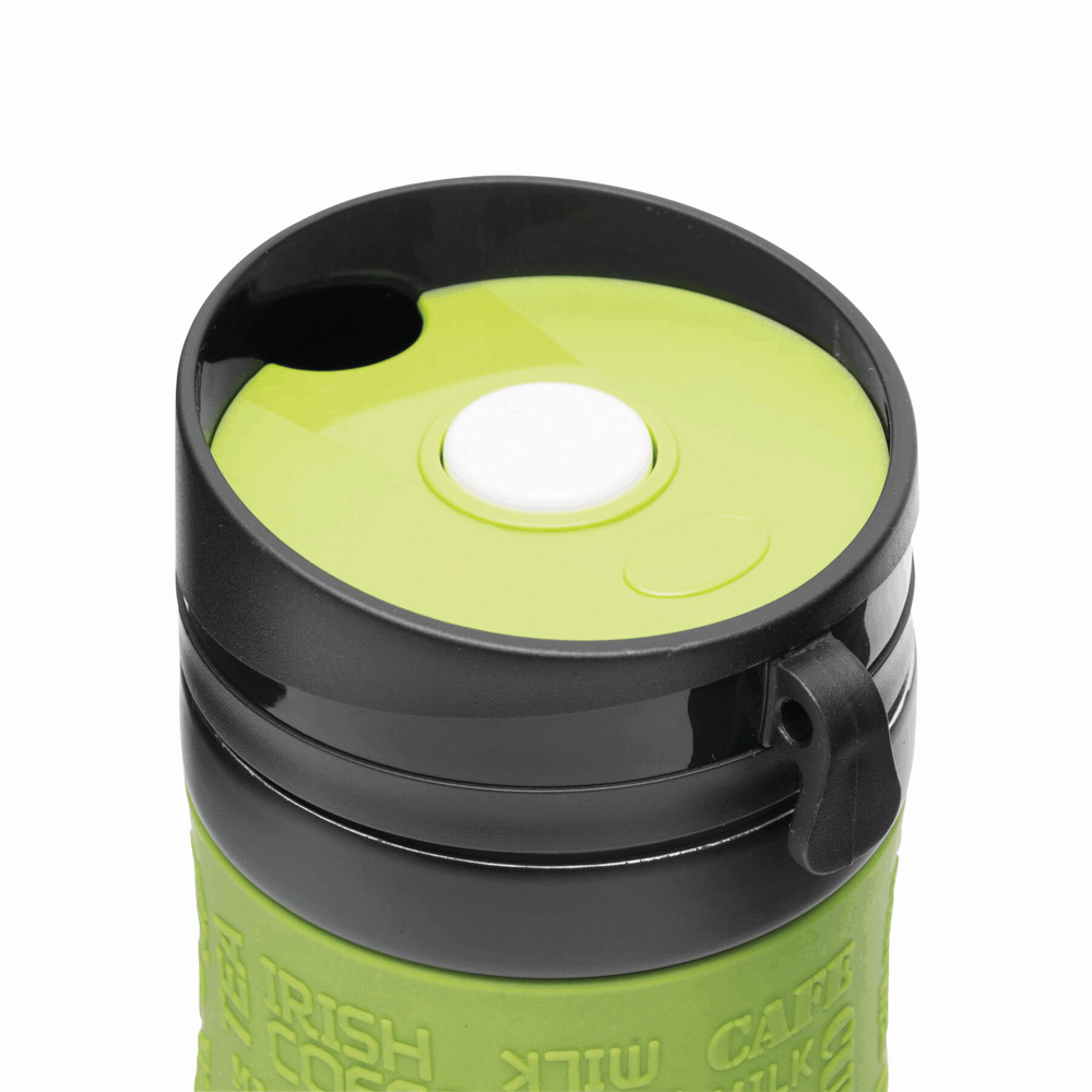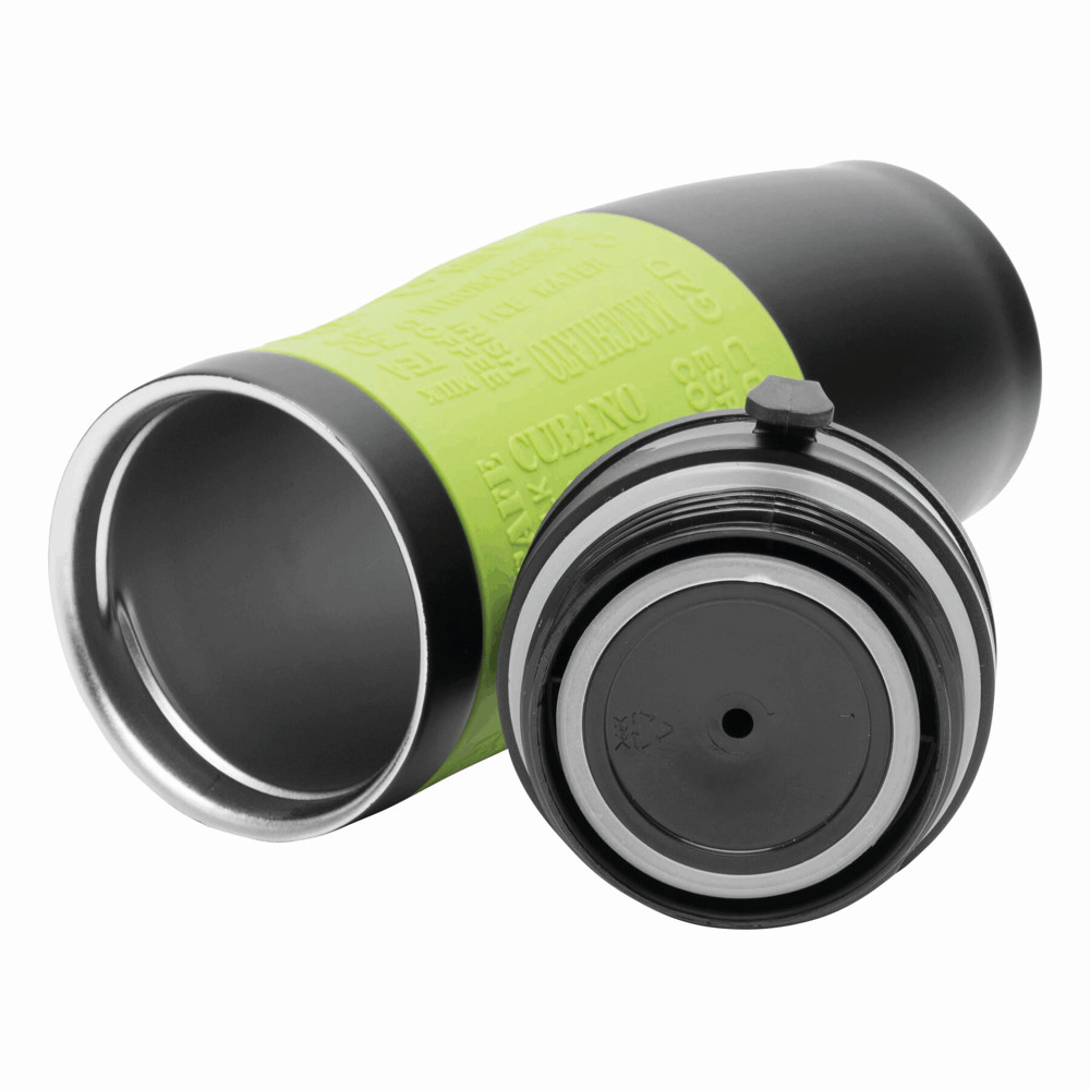 Dubbelwandige isoleerbeker van roestvrij staal GOLDEN DREAM met een inhoud van ca. 380 ml. Schroefdeksel met geïntegreerde drinktuit en handig haakje om het deksel aan de beker op te hangen. Voor een goede grip is de buitenzijde van siliconen-materiaal.