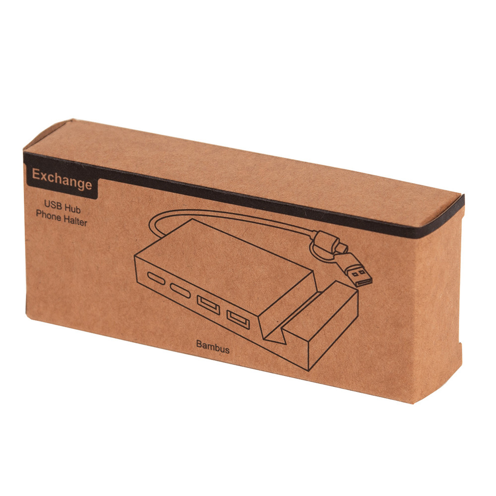 Telefoonhouder EXCHANGE: met USB-hub, 2 poorten USB A en 2 poorten USB type C, in bamboe behuizing, kabellengte ca. 18,5 cm, gecombineerde USB A / type C ingangsstekker