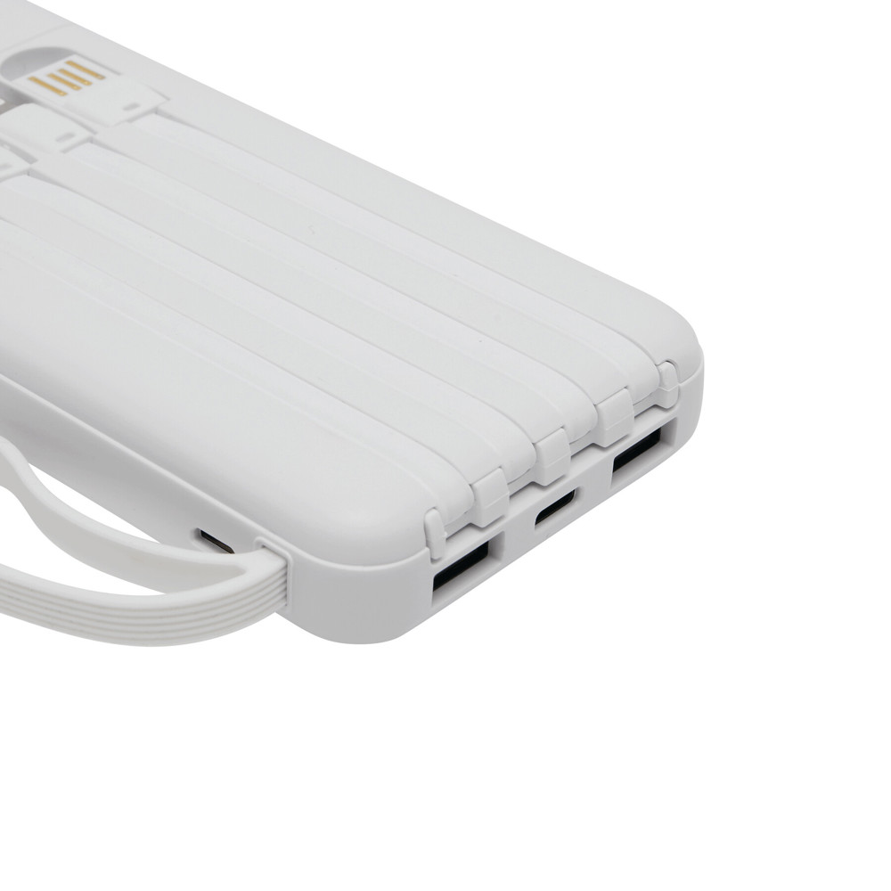 Powerbank MULTI CHARGE: geschikt voor smartphones en USB-apparaten, 2 USB type A en 1 type C uitgangen, capaciteit: 10.000 mAh, 4 geïntegreerde oplaadkabels aan de achterkant (type C, micro-USB, Lightning® en USB type A), laadniveau-indicator (25 / 50 / 75 / 100 %), krachtige batterij, ingangsvermogen: 5V/2A, uitgangsvermogen: 5V/2A (max.), met uittrekbare smartphonehouder, met aan/uit-schakelaar