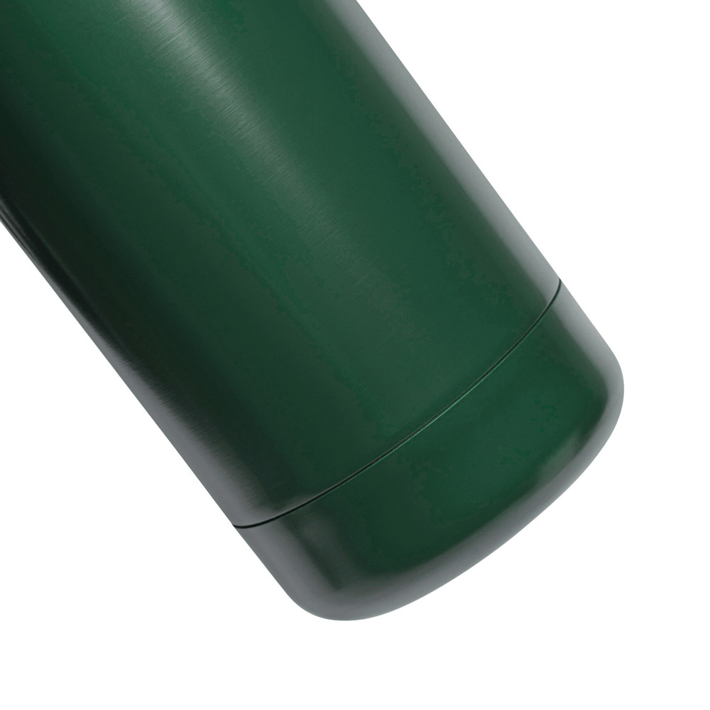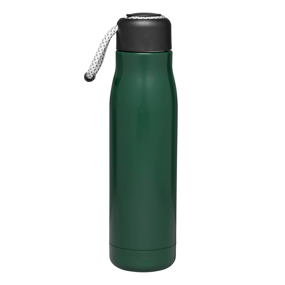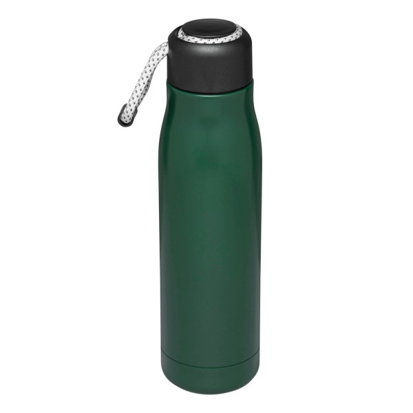 Vacuüm isoleerfles ROBUSTA, dubbelwandig: buiten- en binnenkant van roestvrij staal, zwarte deksel met veilige schroefdop en decoratieve draagriem, inhoud: ca. 500 ml, houdt ca. 8 uur warm en koud voor maximaal 12 uur