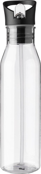 rPET drinkfles (730 ml) met inklapbare tuit en rietje binnenin. Draaglus aan de bovenkant van het PP-deksel. Verpakt in bulk met vloeipapier.