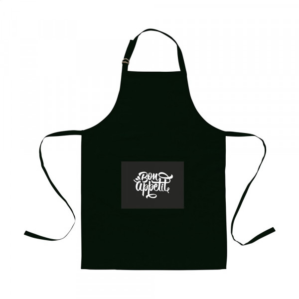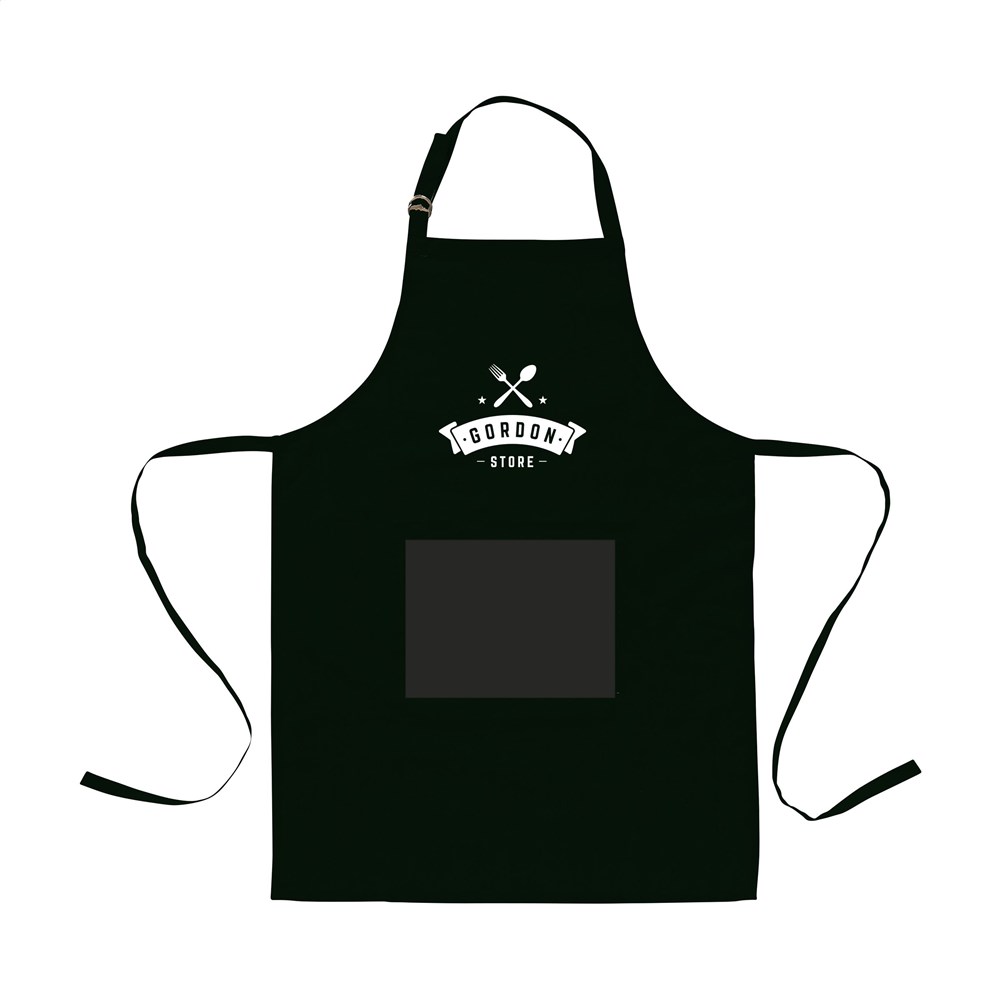 Schort van 100% organisch katoen (180 g/m²). Met een opgestikte zak. De nekband is middels een metalen gesp te verstellen. Past altijd.