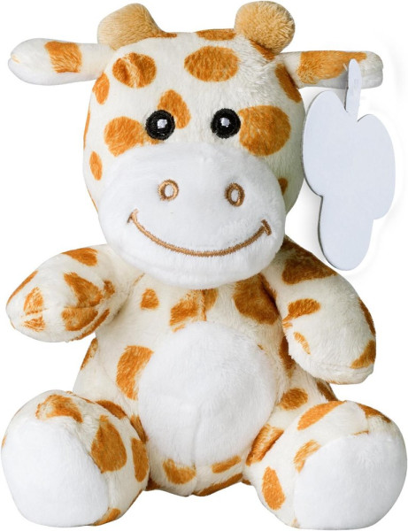 Pluche knuffelgiraf. Geborduurde ogen. Inclusief kartonnen label voor bedrukking.