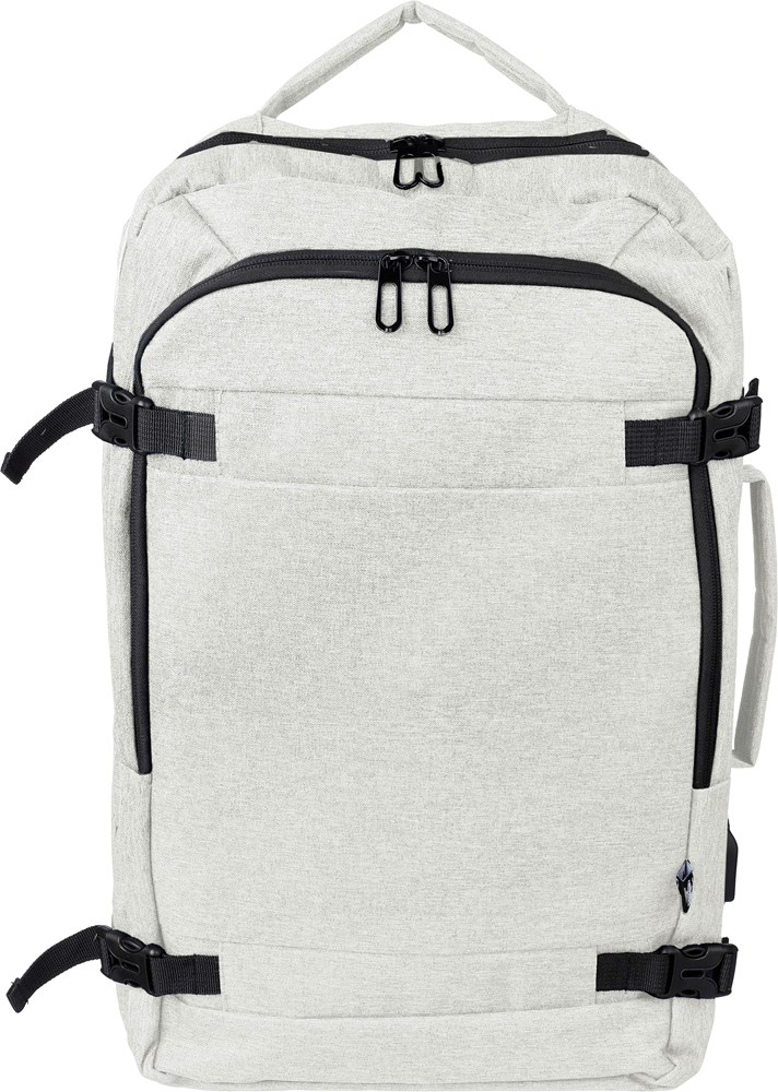 rPET polyester (300D) rugzak met 210D gevoerd laptopvak (17 inch) aan de binnenkant. Cabin-proof. Met draaglus aan de bovenkant en zijkanten. Laptopvak met klittenband, anti-diefstalvak en twee grote vakken met ritssluiting. Ventilerend gewatteerde rug, trolleyband, sluitgespen en USB-A poort aan de zijkant. Met zijgespen om de bagage compact te houden. Draaggewicht ca. 12 kg. Inclusief rPET-label.