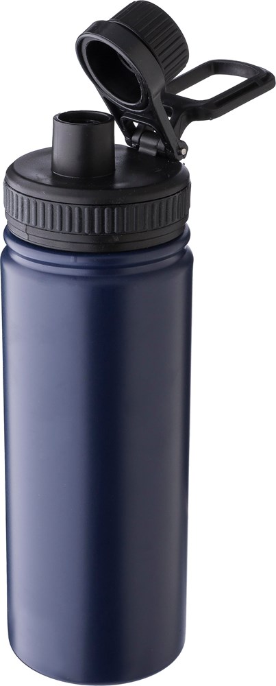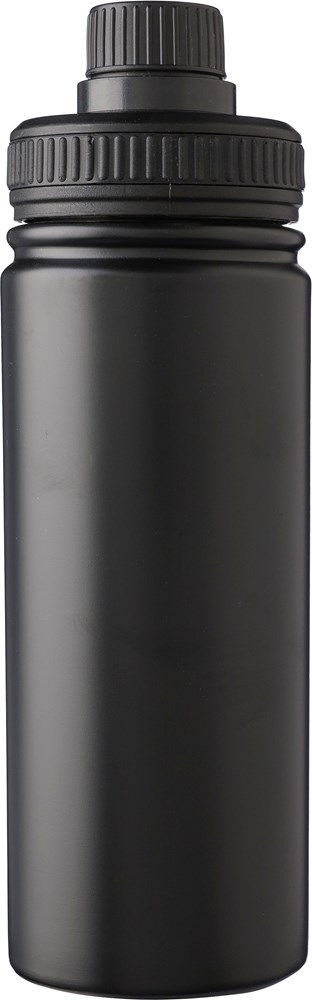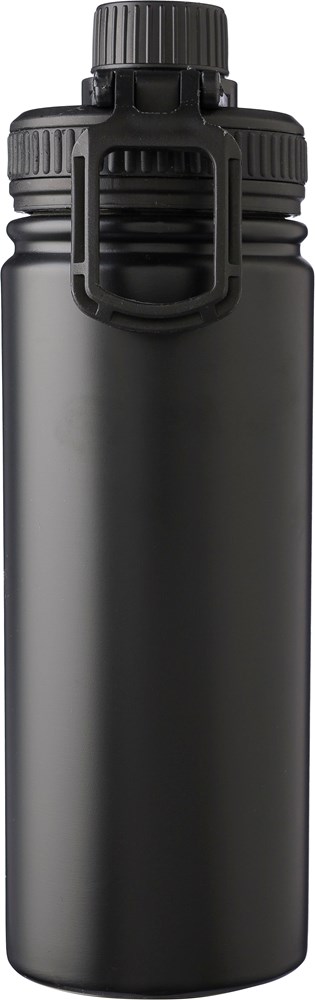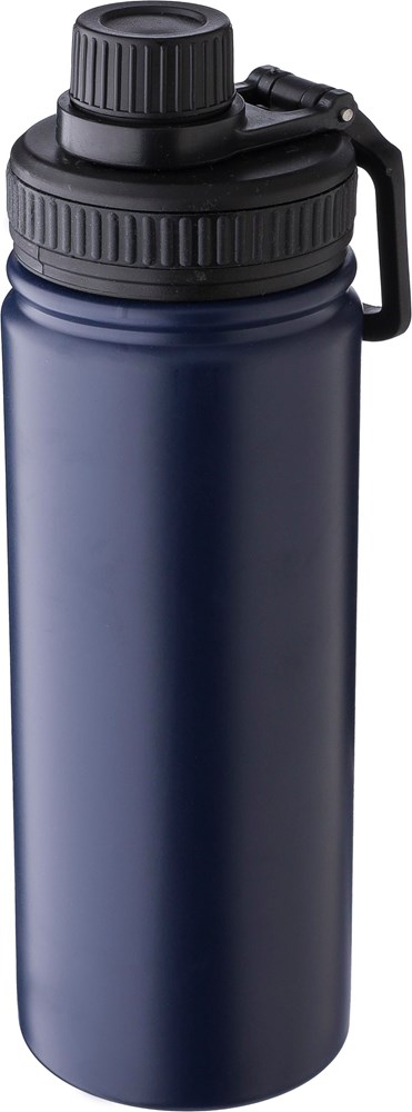 Roestvrijstalen dubbelwandige drinkfles (500 ml) met PP-dop, PP schroefdop en draaghandvat. De binnenkant is van roestvrij staal 304 en de buitenkant van roestvrij staal 201. Per stuk verpakt in een bruin kartonnen doos.