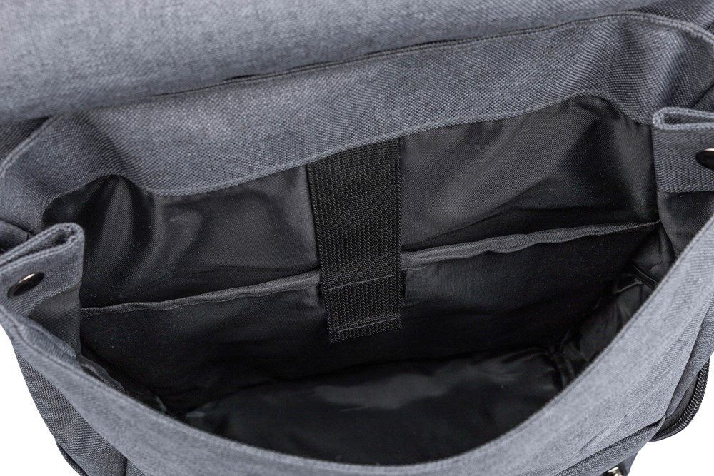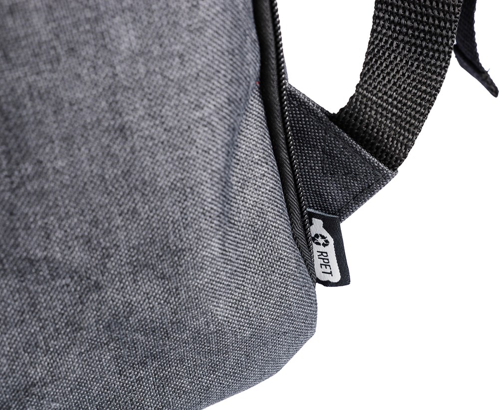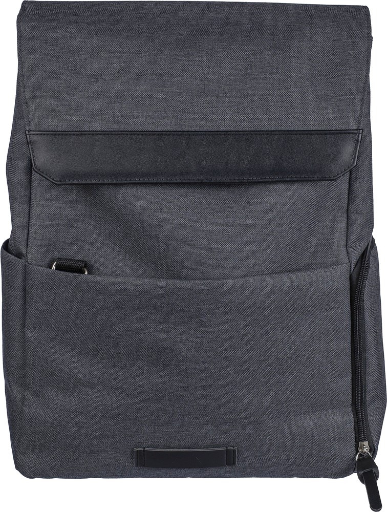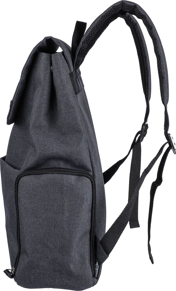 600D polyester canvas laptop rugzak (15 inch) met PVC-detail en 210D voering. Voorzien van een klein voorvak met rits en een karabijnhaak voor sleutels, een zijvak met rits, een regulier zijvak en een groot vak met magneetsluiting en laptopvak. Drukknoppen aan de zijkant om de rugzak te sluiten wanneer deze niet volledig gevuld is. Verstelbare ventilerende schouderriemen. Inclusief een rPET-label aan de voorkant.