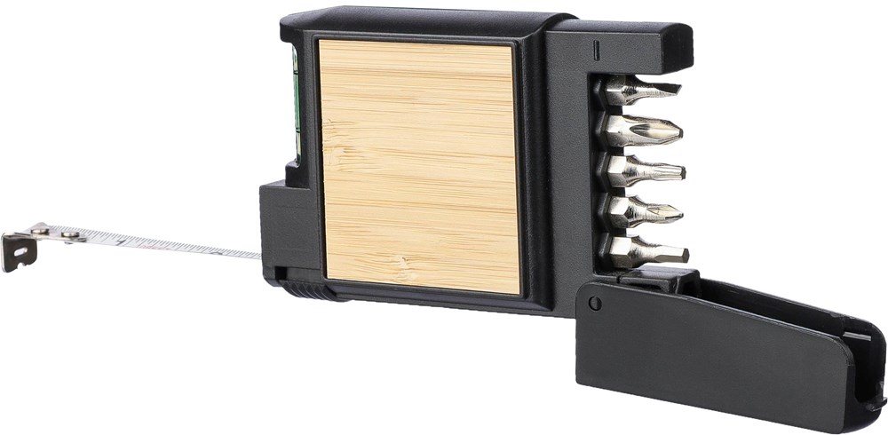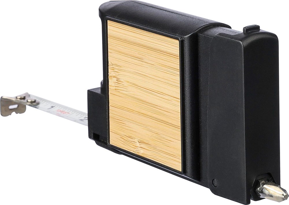 ABS meetlint met bamboe accenten en waterpas. Lengte van 3 meter. Inclusief 5 bits om het item als schroevendraaier te gebruiken. 12 mm metalen lint. Per stuk verpakt in een bruin kartonnen doosje.