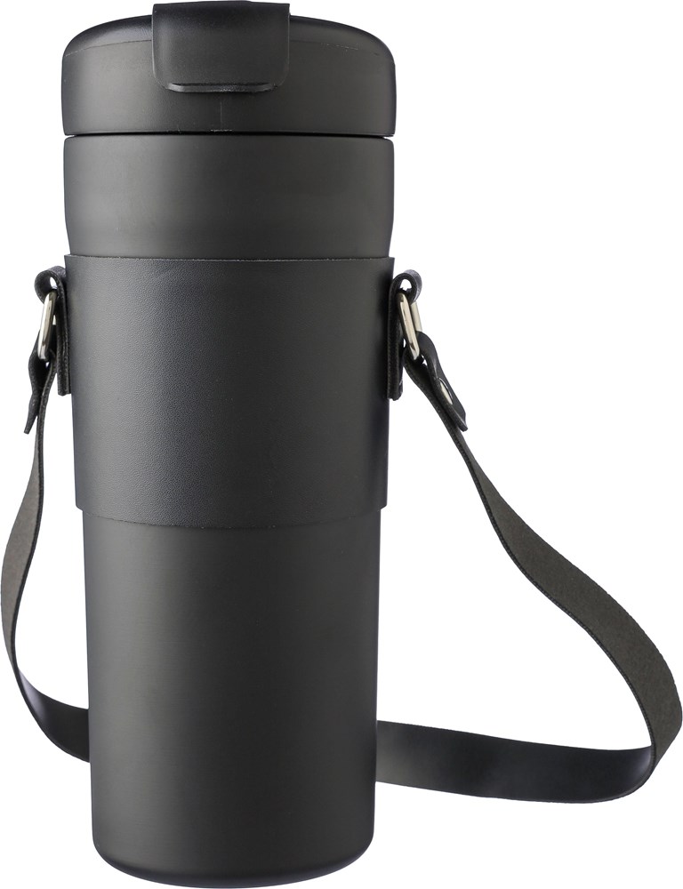 Roestvrijstalen dubbelwandige drinkfles (730 ml) met een PU-draaghoes, rietje en draagband. De binnenkant is van roestvrij staal 304 en de buitenkant van roestvrij staal 201. PP-dop met een drukknop om de drinktuit te openen of te sluiten, met een aparte drinkopening. Houdt de inhoud 6 uur warm of 10 uur koud. Per stuk verpakt in een bruin kartonnen doos.
