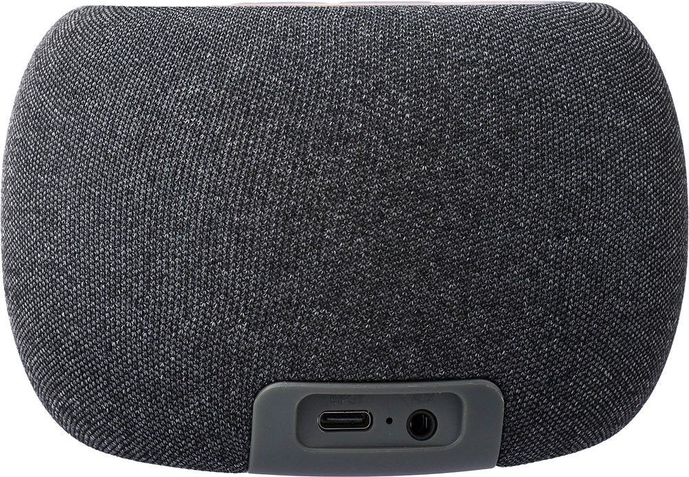Bamboe en gerecycled ABS-luidspreker met stofdetails rondom de luidspreker. 5W output, DC 5V input, 1.200mAh ingebouwde oplaadbare batterij, met 6 uur speeltijd. Werkafstand van 15-20 meter, signaal-ruisverhouding van 87 dB. Frequentiebereik: 100 Hz tot 20 kHz. Inclusief 50 cm Type-C oplaadkabel. Draadloze verbindingstechnologie: 5.2, 5W draadloos opladen. Per stuk verpakt in een bruin kartonnen doos.
